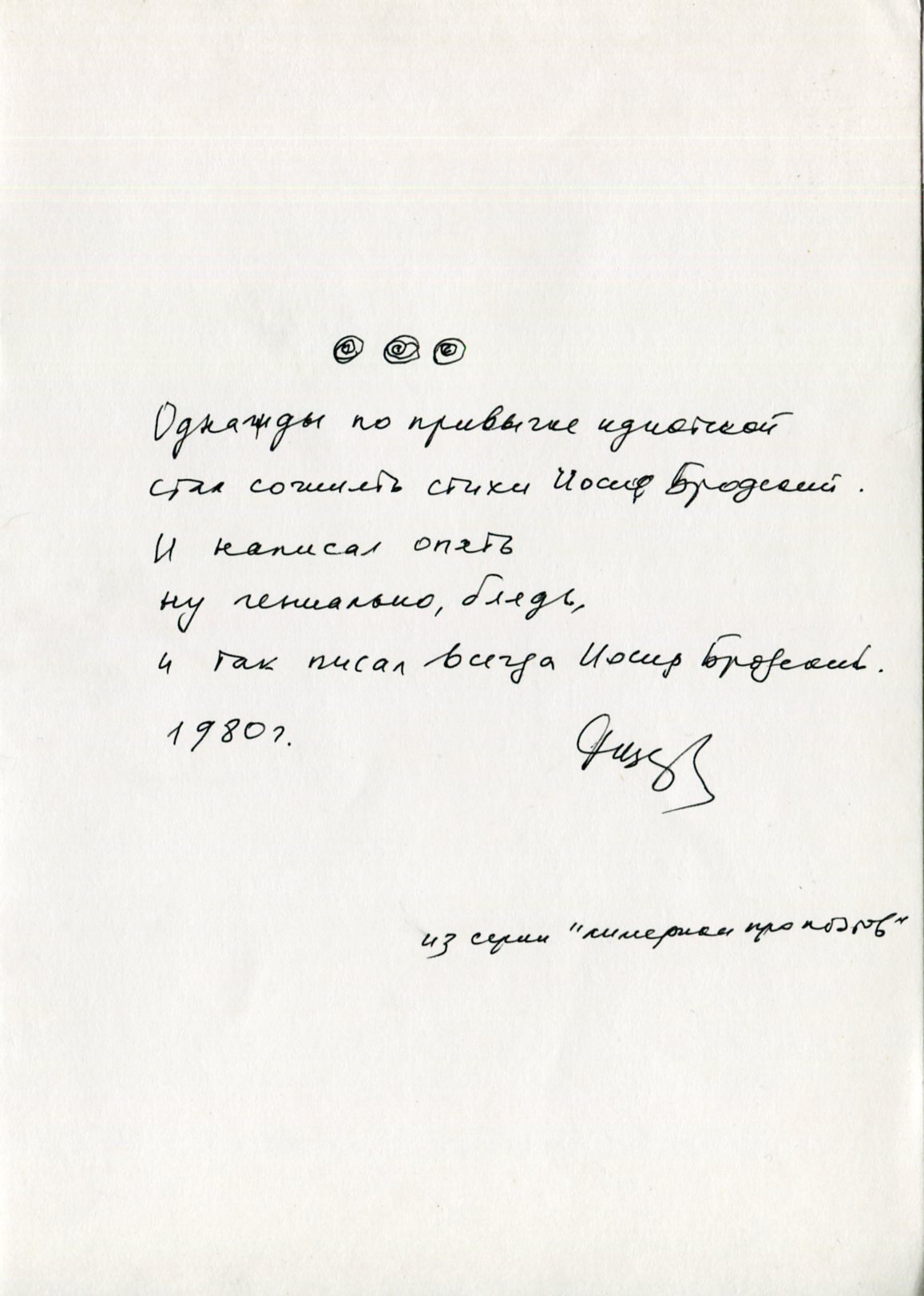 Автографы пятистиший Татьяны Щербины на отдельных листах. «Однажды по привычке идиотской / стал сочинять стихи Иосиф Бродский. / И написал опять / ну гениально, бл...дь, / и так писал всегда Иосиф Бродский».
