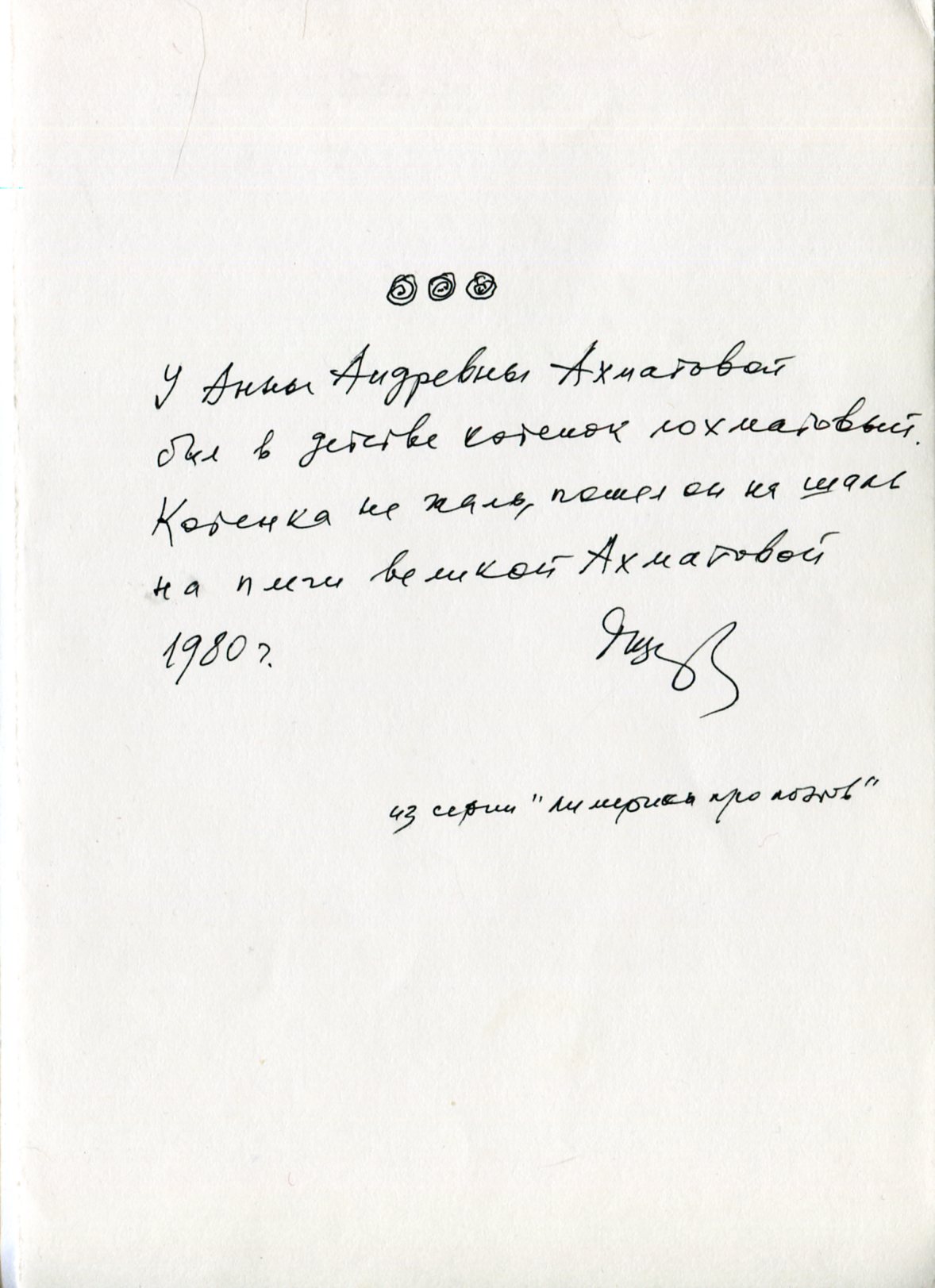 «У Анны Андревны Ахматовой / Был в детстве котенок лохматовый. / Котенка не жаль, / Пошел он на шаль / На плечи великой Ахматовой».