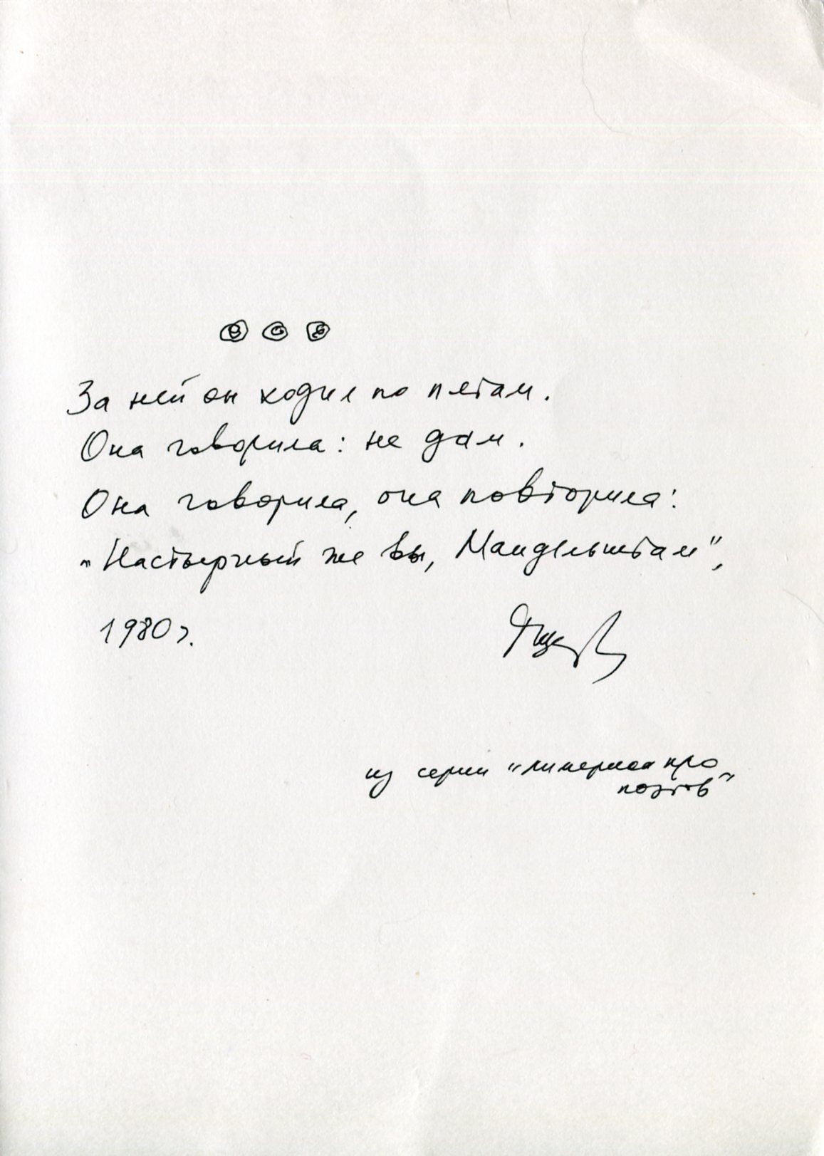 «За ней он ходил по пятам. / Она говорила: не дам. / Она говорила, / она повторила: / «Настырный же Вы, Мандельштам».
