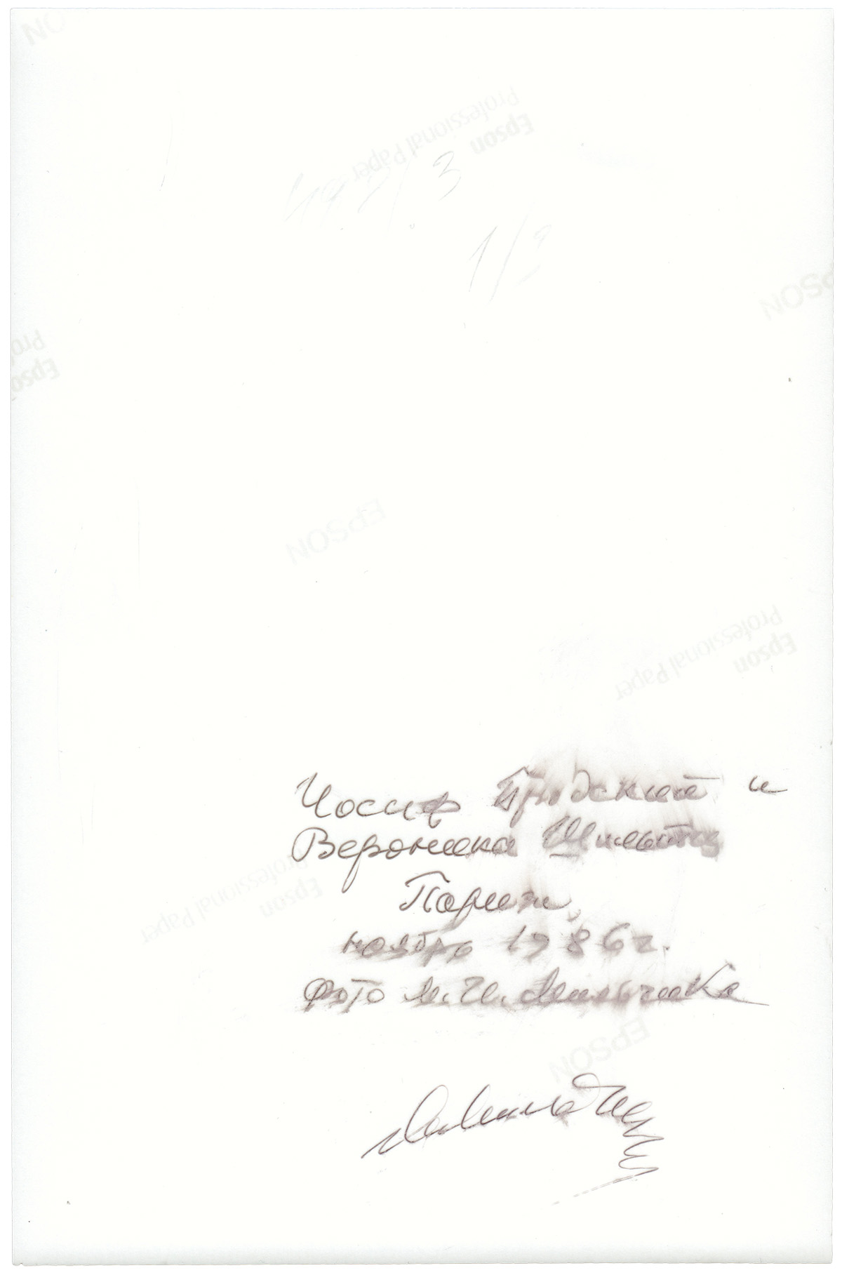 На обороте надписи фотографа. Михаил Исаевич Мильчик (1934) — искусствовед, член Союза архитекторов России, член Советов по сохранению культурного наследия при правительстве Санкт-Петербурга и Министерстве культуры РФ, лауреат премии фонда имени академика Д. С. Лихачева «За сохранение культурного наследия России». В начале 1960-х познакомился с ленинградскими поэтами Иосифом Бродским, Евгением Рейном и др. Впоследствии возглавил правление Фонда создания музея Иосифа Бродского в Санкт-Петербурге, написал и издал три книги о нем, иллюстрированные собственными фотографиями.