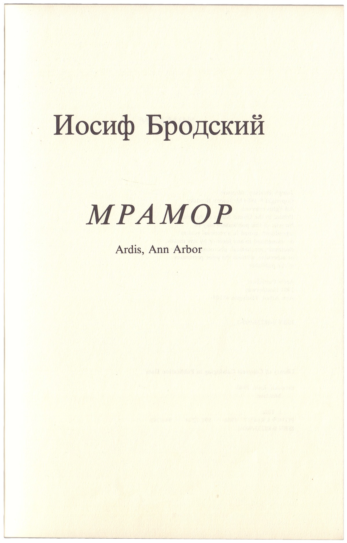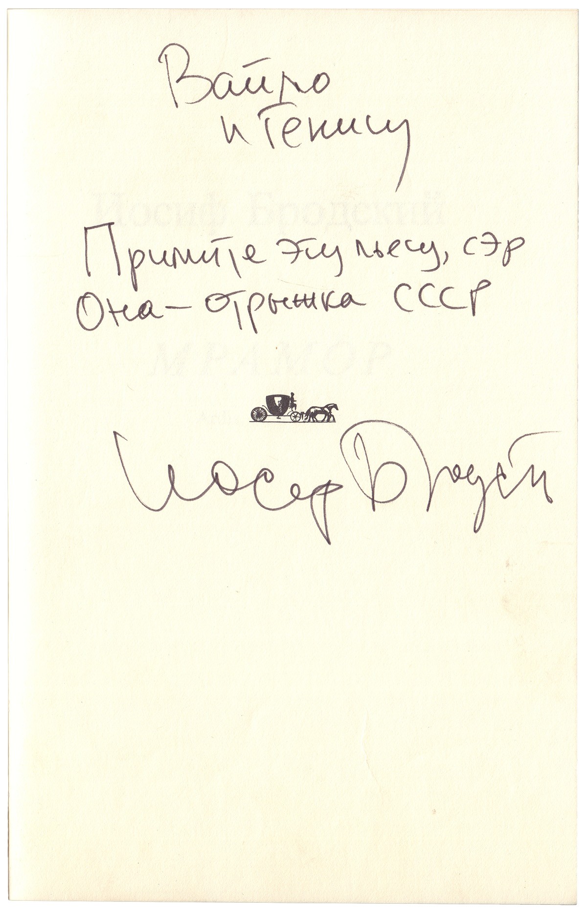 Дарственная надпись рукой Иосифа Бродского на странице марки издательства, адресованная Петру Вайлю: «Вайлю / и Генису / Примите эту пьесу, сэр / она — отрыжка СССР / Иосиф Бродский». По воспоминаниям Александра Гениса, «это специальное издание крохотным тиражом и даже без картинки на обложке. Мы были у Бродского дома, когда он только получил эти книги из Ардиса. Он был страшно занят: писал Нобелевскую речь. Но написал нам по стишку. В Петиной книге стоит: “Возьмите эту книгу, сэр, она – отрыжка ЭсЭсЭСЭр”. Явный экспромт. Мы сразу же написали про пьесу эссе, кажется первыми».