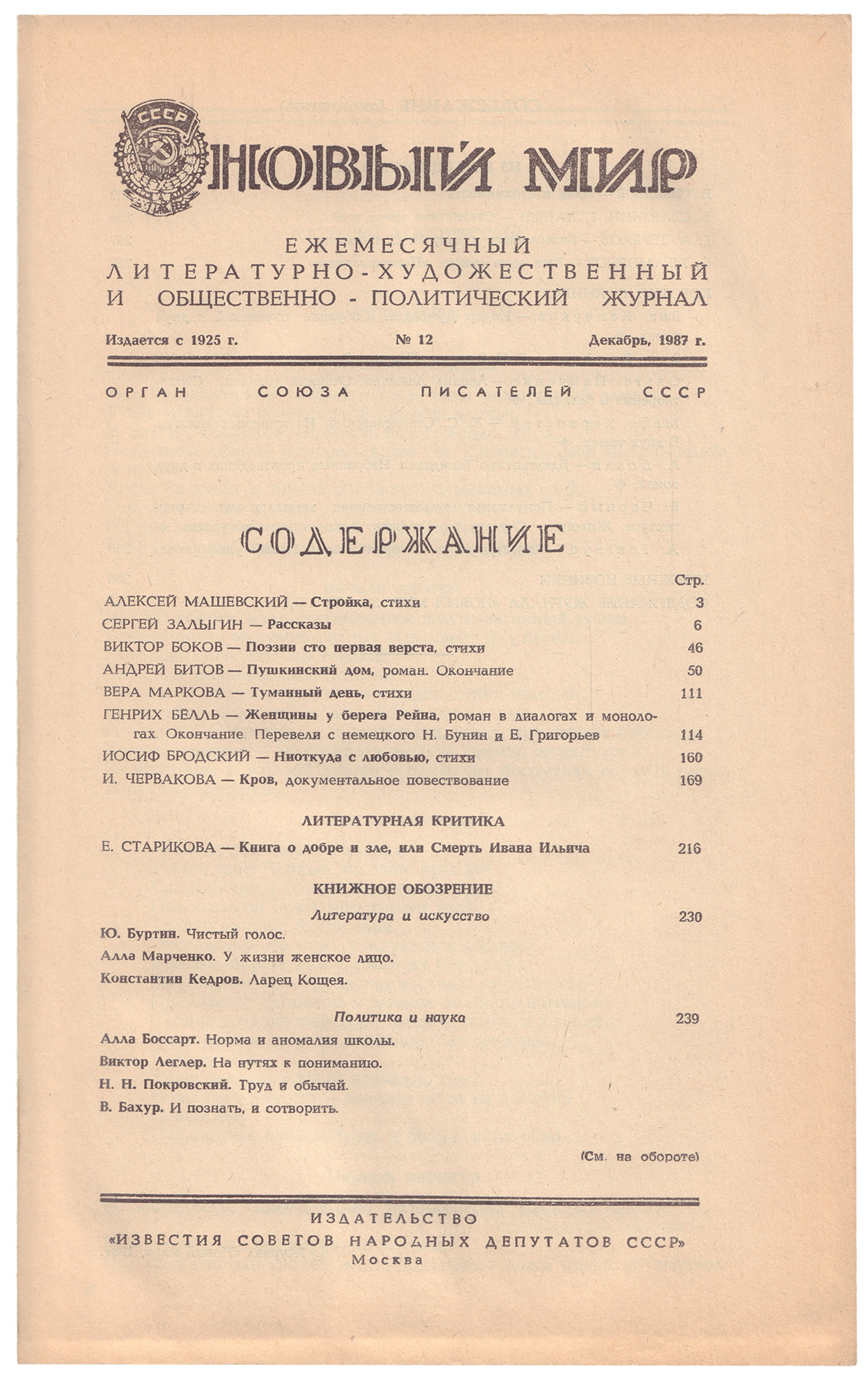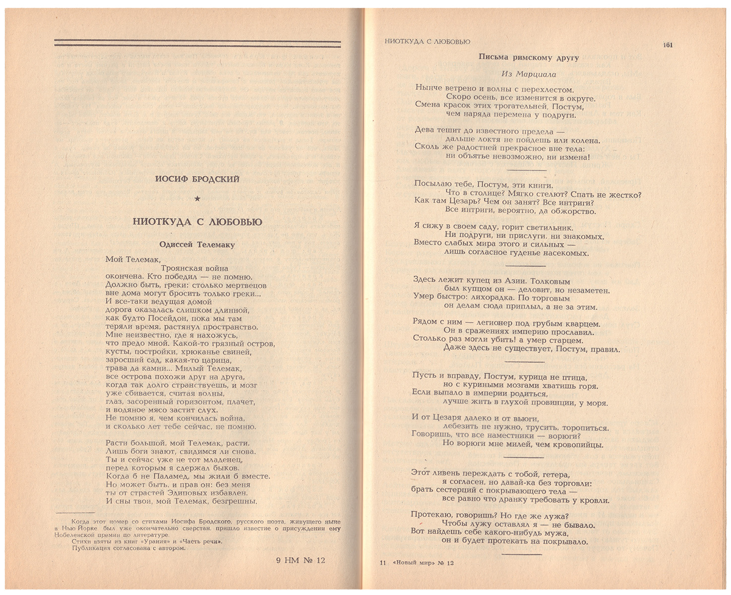В шрифтовой издательской обложке. В декабре 1987 года — впервые после отъезда Иосифа Бродского из Советского Союза опубликованы его стихи. Шесть стихотворений Иосифа Бродского выходят в № 12 «Нового мира» под заголовком «Ниоткуда с любовью», накануне присуждения Нобелевской премии по литературе. Как отмечает исследователь творчества Бродского Лев Лосев, разрешения добился поэт и редактор отдела поэзии журнала «Новый мир» Олег Чухонцев. «Видимо, не намеренно, — пишет Лосев, — но большинство вошедших в подборку вещей составили «письма» — цикл «Письма римскому другу», диптих «Письма династии Минь», а также «Одиссей Телемаку» и «Ниоткуда с любовью, надцатого мартобря...». Имя поэта, с 1972 года находящегося в эмиграции, с 1980-го — гражданина Америки, было под запретом в советской печати, и разрешение на публикацию о нем дается только с началом перестройки Горбачева.