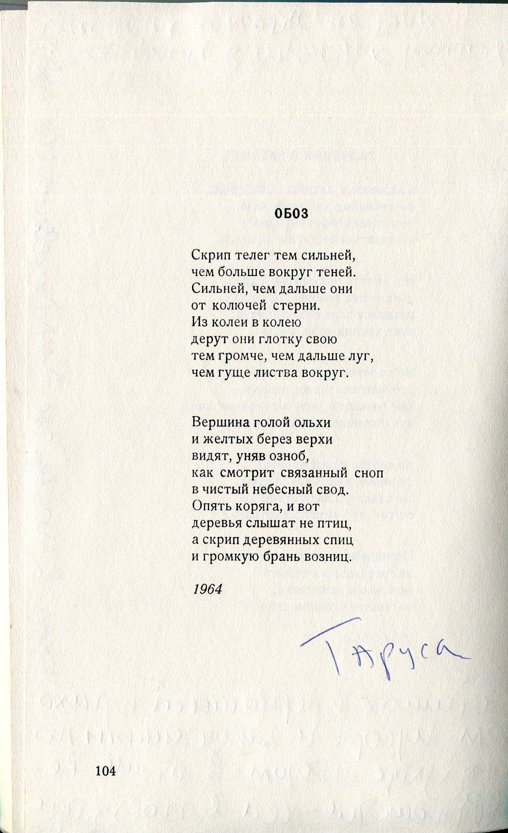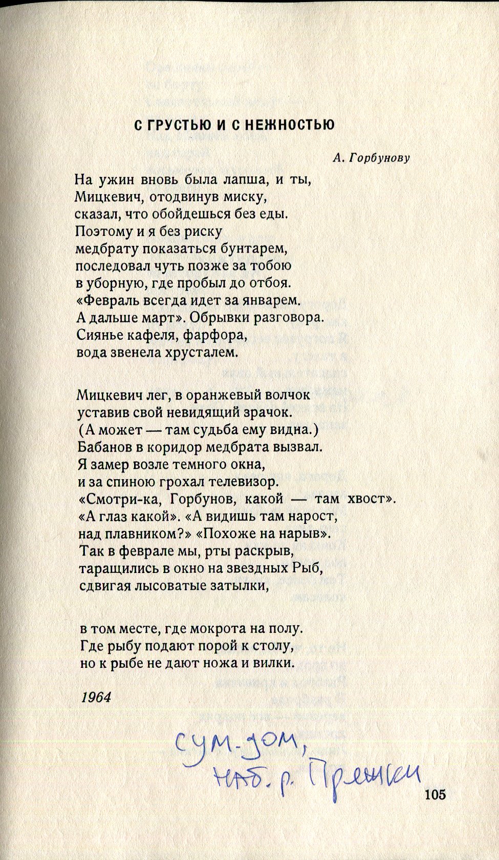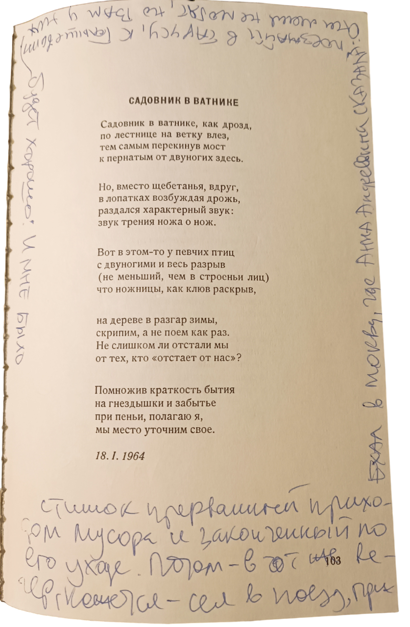 В иллюстрированной издательской обложке. Бродский не только сделал дарственную надпись и комментарий к стиховторению "Садовник в ватнике", но и отметил место написания многих стихов, в некоторых случаях развернутое: на с. 82 под "Песней счастливой зимы" - "Ленинград-Нарва ночной автобус", на с. 105 - "сум.дом, на.. р. Пряжки", на с. 166 - к строке "дом с аптекой" автор поставил звездочку и сноску к ней внизу "Тишинская пл., д.6, кв. 11". На с. 79, 81, 83, 84, 86, 93, 104, 107, 109, 110, 111, 112, 114, 115, 116, 160, 165, 226 - указаны деревня Норенская, Паланга, Таруса и др.