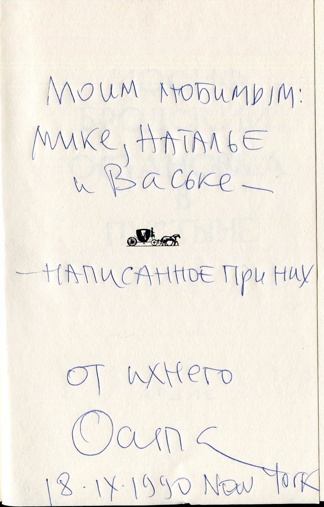 На свободном л. форзаца дарственная надпись поэта, адресованная семье Голышевых: "Моим любимым: Мике, Наталье и Ваське - написанное при них от ихнего Осипа / 18. IX 1990 New York". На стр. 103 со стихотворением "Садовник в ватнике" по периметру листа надписи Иосифа Бродского: "Стишок, прерванный приходом мусора и законченный по его уходе. Потом - в тот же вечер, кажется, - сел в поезд, приехал в Москву, где Анна Андреевна сказала: поезжайте в Тарусу, к Голышевым. Они меня не любят, но Вам у них будет хорошо". И мне было".