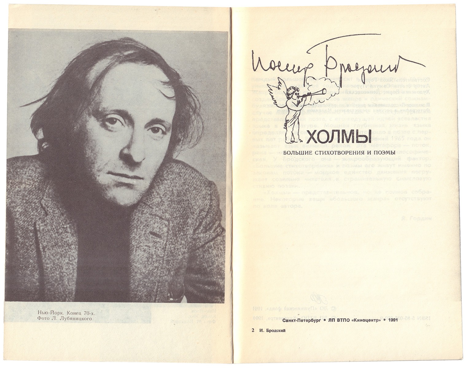 1. Бродский И.А. Х. Осенний крик ястреба: Стихотворения 1962-1989 годов / Иосиф Бродский. - Л.: ИМА-пресс, 1990. - 127, [1] с. ; 20х13 см. В шрифтовой издательской обложке. 2. Бродский И.А. Холмы. Большие стихотворения и поэмы / И.А. Бродский; сост. Я. Гордин; автор статьи С. Лурье; худож. Б. Денисовский. - Л.: Киноцентр, Пушкинский фонд 1991. - 360 с., ил., портр.; 20x13 см.