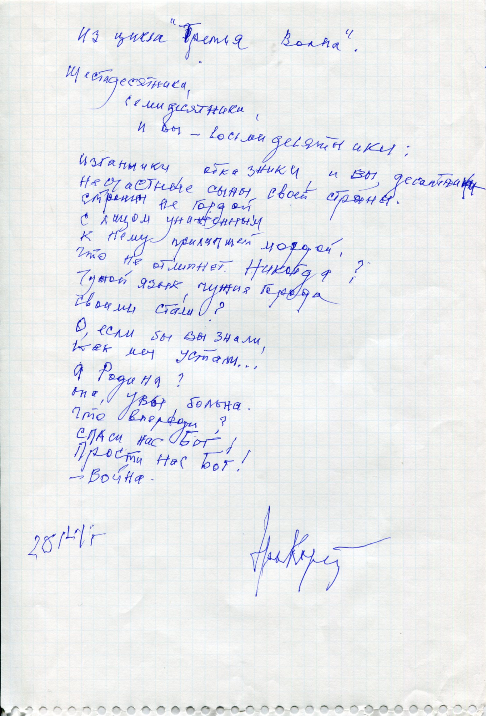 Автограф стихотворения Эры Коробовой на листе из блокнота: "Шестидесятники, семидесятники и вы восьмидесятники, / изгнанники, отказники и вы, десантники, / несчастные сыны своей страны, / страны негордой, / с лицом униженным / к нему прилипшей мордой. / Что не отлипнет никогда? / Чужой язык, чужие города / своими стали? / О, если бы вы знали, / как мы устали... / А Родина? / она, увы, больна. / Что впереди? / Спаси нас Бог! / Прости нас Бог! / – Война. 2014".