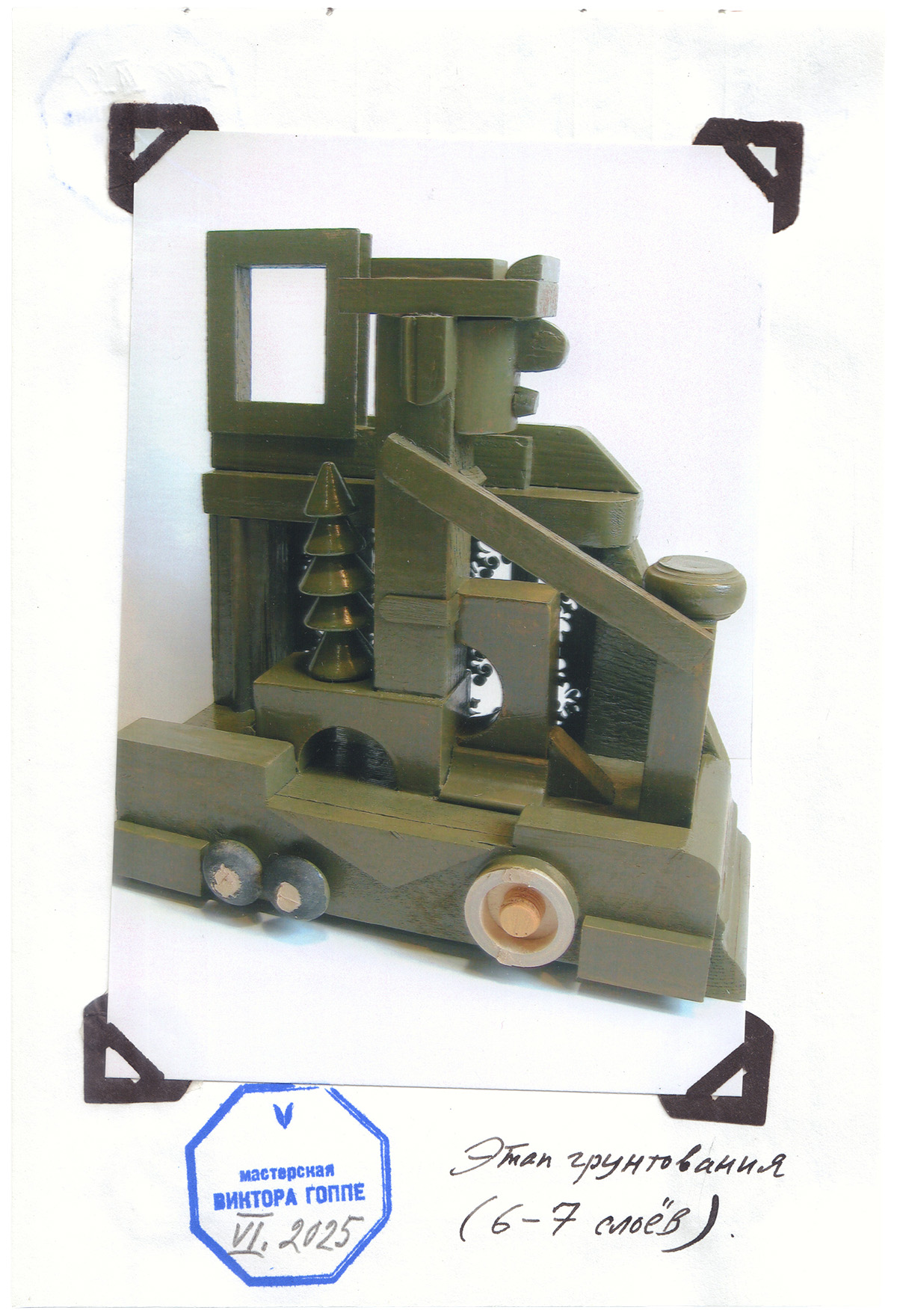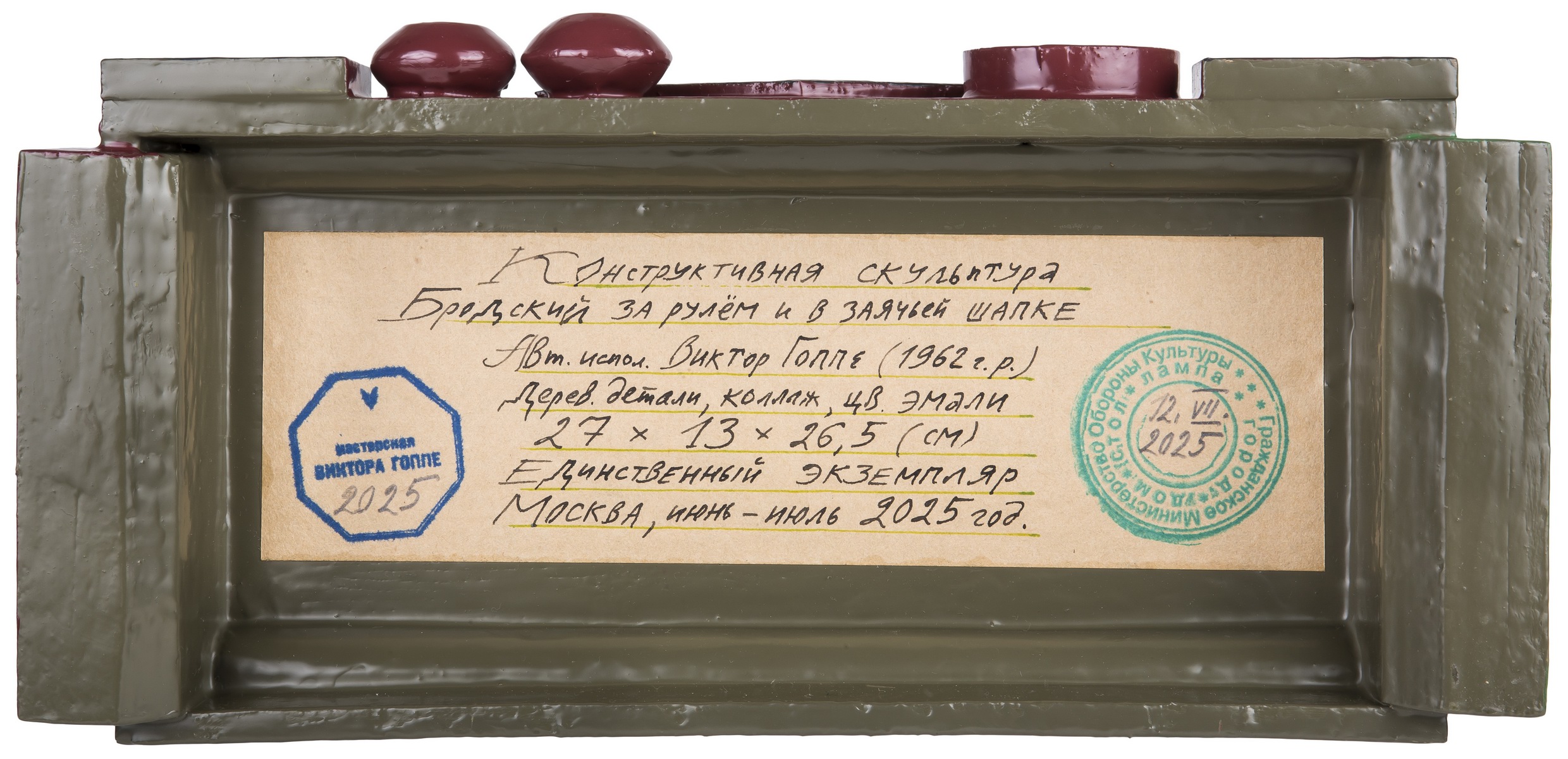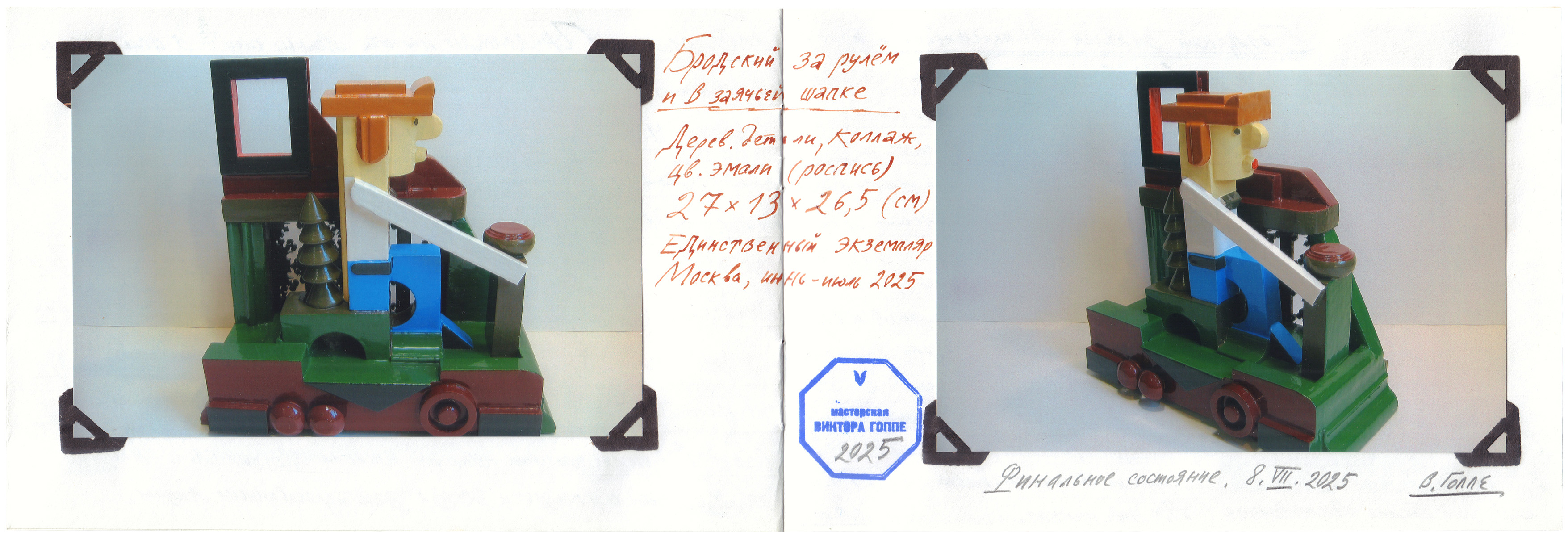 Дерево; роспись цветными эмалями. Выполнена в единственном экземпляре. Бум. авторская этикетка с рукописными выходными данными и штампом мастера на основании. Прилагается папка с описанием хода работы.