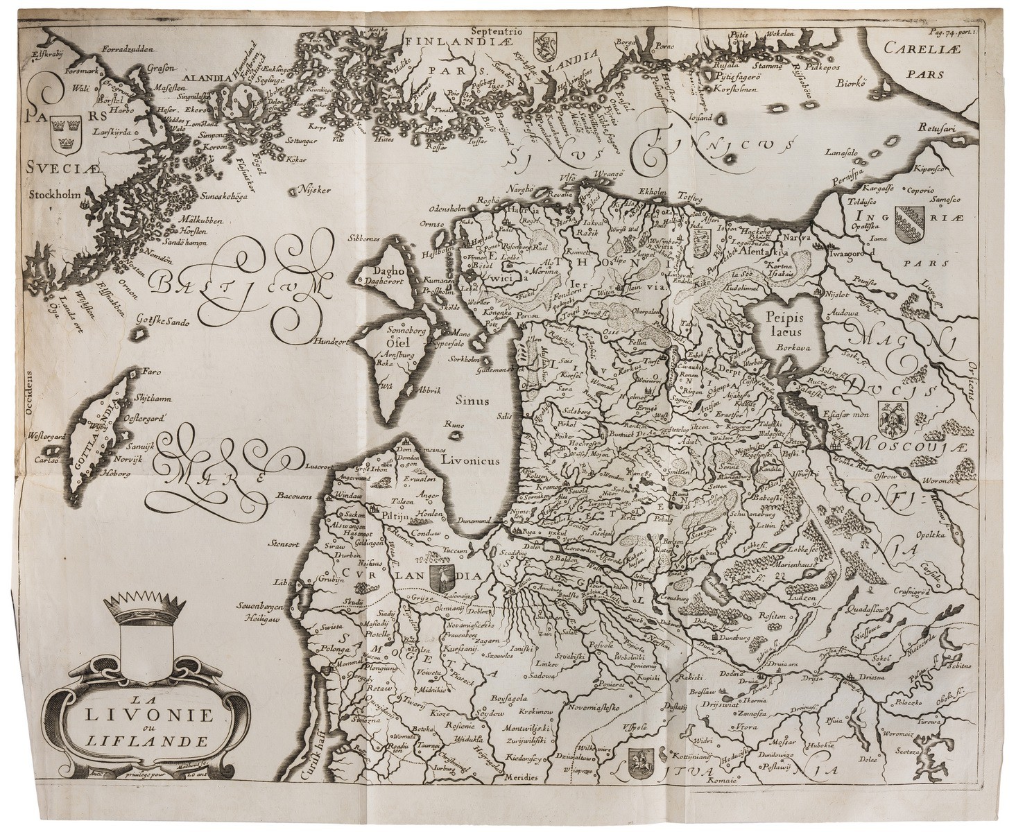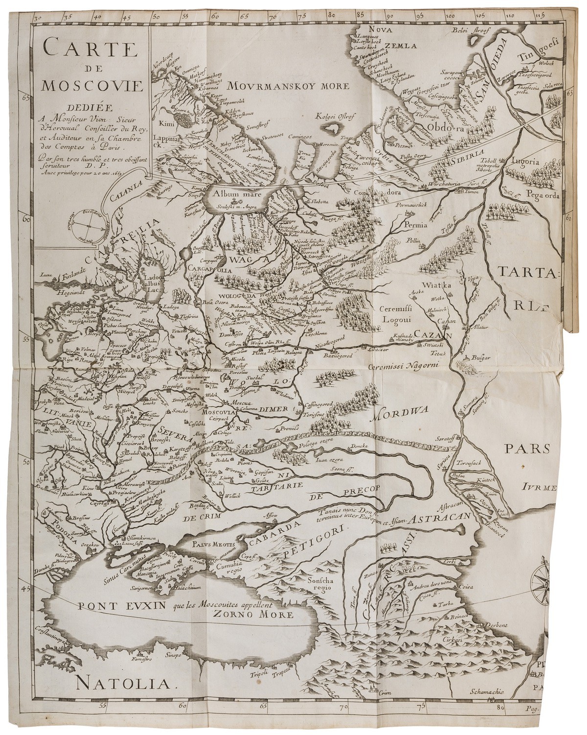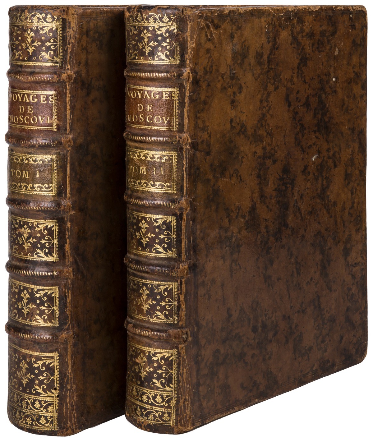 В двух цельнокожаных переплетах XVIII века с золотым тиснением по корешкам. Золотые дублюры. Форзацы оклеены бумагой «под мрамор». Тройные тонированные обрезы. На фр. яз. Богато иллюстрированное издание: гравированные заставки и буквицы, большие раскладные карты («Карта Московии», «Ливония и Лифляндия», «Новая карта Персии», «Плодородные провинции Гилянь и Гиркания», «Ост-Индия»), в т.ч. панорамная иллюстрация «Карта нижнего течения реки Волга» длиной более метра. На с. 238 первого тома помещена азбука церковнославянского языка.