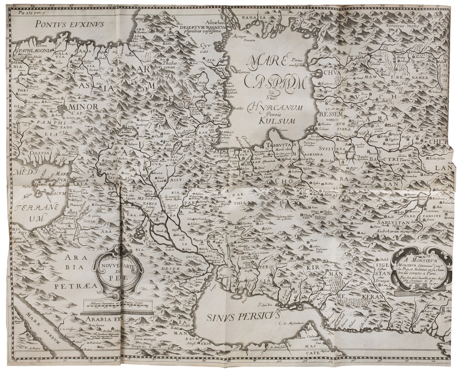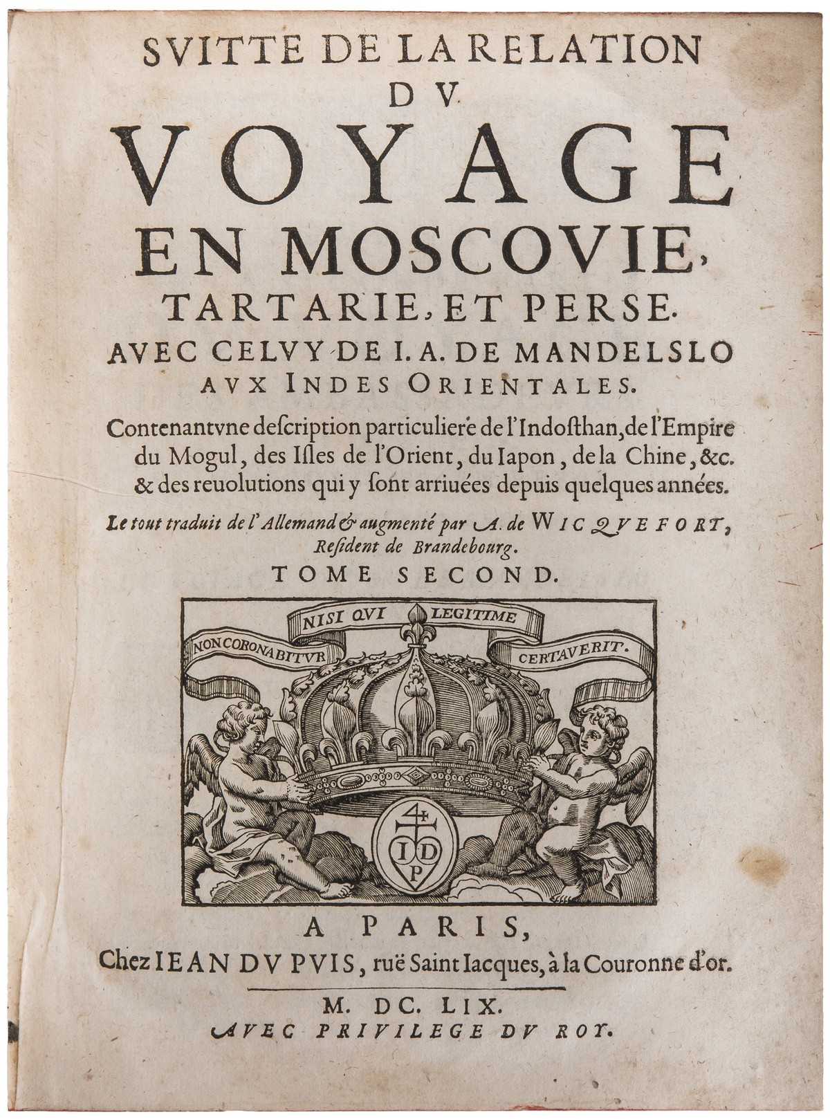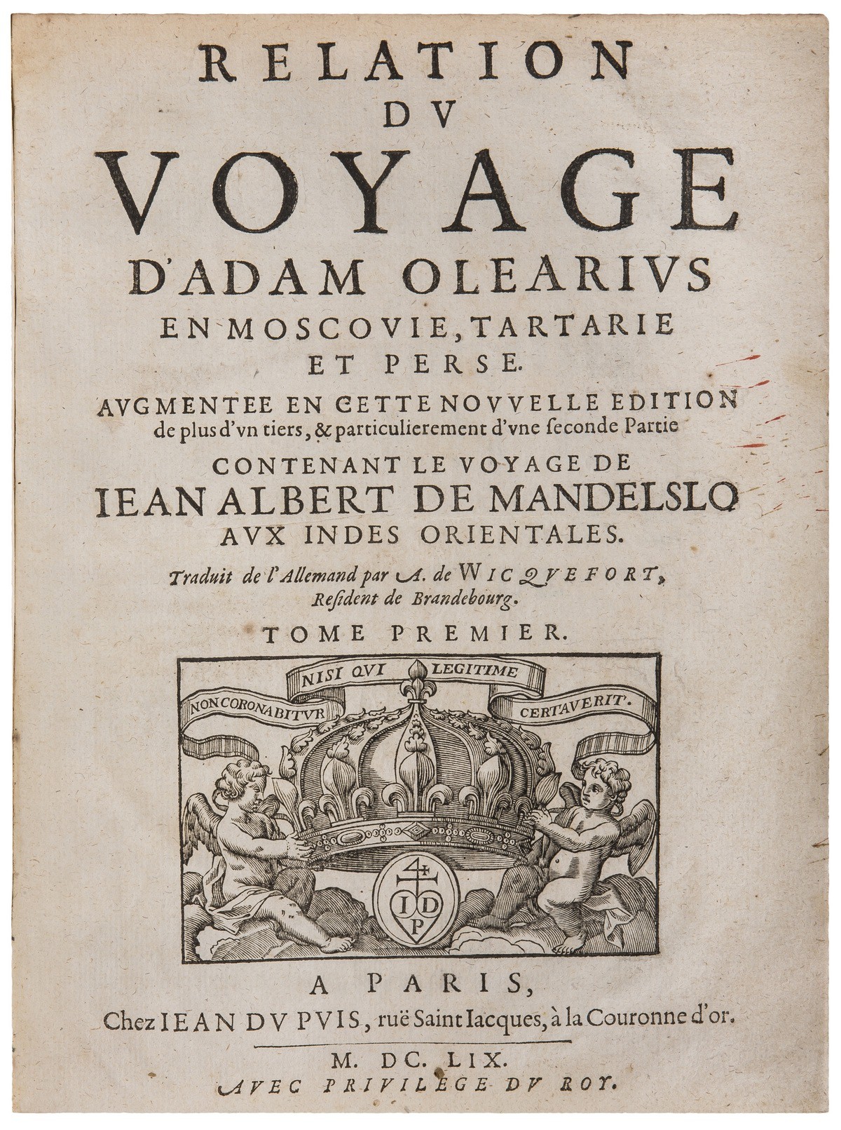 Первое издание «Путешествия» Адама Олеария увидело свет на немецком языке в Шлезвиге в 1647 году; второе издание на языке оригинала вышло с обширными дополнениями в 1656, третье — в 1663 году, также с добавлениями. Первый перевод на французский язык (и первый перевод с языка оригинала на другие языки вообще) книги Олеария был отпечатан в Париже в 1656 году, а первый полный французский перевод со второго расширенного немецкого издания 1656 года был выполнен Абрахамом де Викфортом и издан в Париже 1659 году. Описание путешествия Адама Олеария в Московию и Тартарию помещено в первом томе издания. Во втором томе помещалось описание путешествия Олеария по Персии и книга Мандельсо о путешествии в Ост-Индию. Знаменитое «Путешествие» Адама Олеария (1599-1671), посла Фридриха III, отправленного к царю Михаилу Федоровичу и шаху Сафи с целью завязать торговые отношения с Москвой и Персией. Морем достигнув Риги, посольство прибыло в Нарву, а затем двинулось через Новгород в Москву. В августе 1634 года посольство въехало в столицу Русского государства и оставалось там четыре месяца, после чего получило согласие царя на пропуск его через русские земли в Персию. Потом они немедленно вернулись в Готторп, чтобы ратифицировать этого соглашение, а в октябре 1635 г. снова отправились в путь на Восток. Второй раз Олеарий и посольство прибыли в Москву 29 марта 1636 года, а покинули город 30 июня. От Нижнего Новгорода посольство на судах по Волге отправилось в Персию, через Каспий. Переговоры там были не такими успешными, как в Москве, и посольство покинуло Исфахан 21 декабря 1637 года и вернулось домой через Решт, Ленкорань, Астрахань, Казань, Москву и другие места. В 1643 году Олеарий вновь побывал в Москве, хотя и не с таким долгим визитом. Это был последний раз, когда он посетил Россию. Адам Олеарий (1599-1671) — путешественник, географ, ориенталист, историк, математик и физик. Является конструктором и куратором создания с 1654 по 1664 года Готторпского глобуса. Будучи секретарём посольства, посланного шлезвиг-голштинским герцогом Фридрихом III к персидскому шаху, записал и опубликовал свои заметки, собранные во время путешествия. Прижизненное издание, первый полный французский перевод. На российских торгах это издание встречается нечасто — известен пример 2023-2024 гг. (только первый том; раскладная панорамная иллюстрация разрезана и вплетена как два отдельных листа).