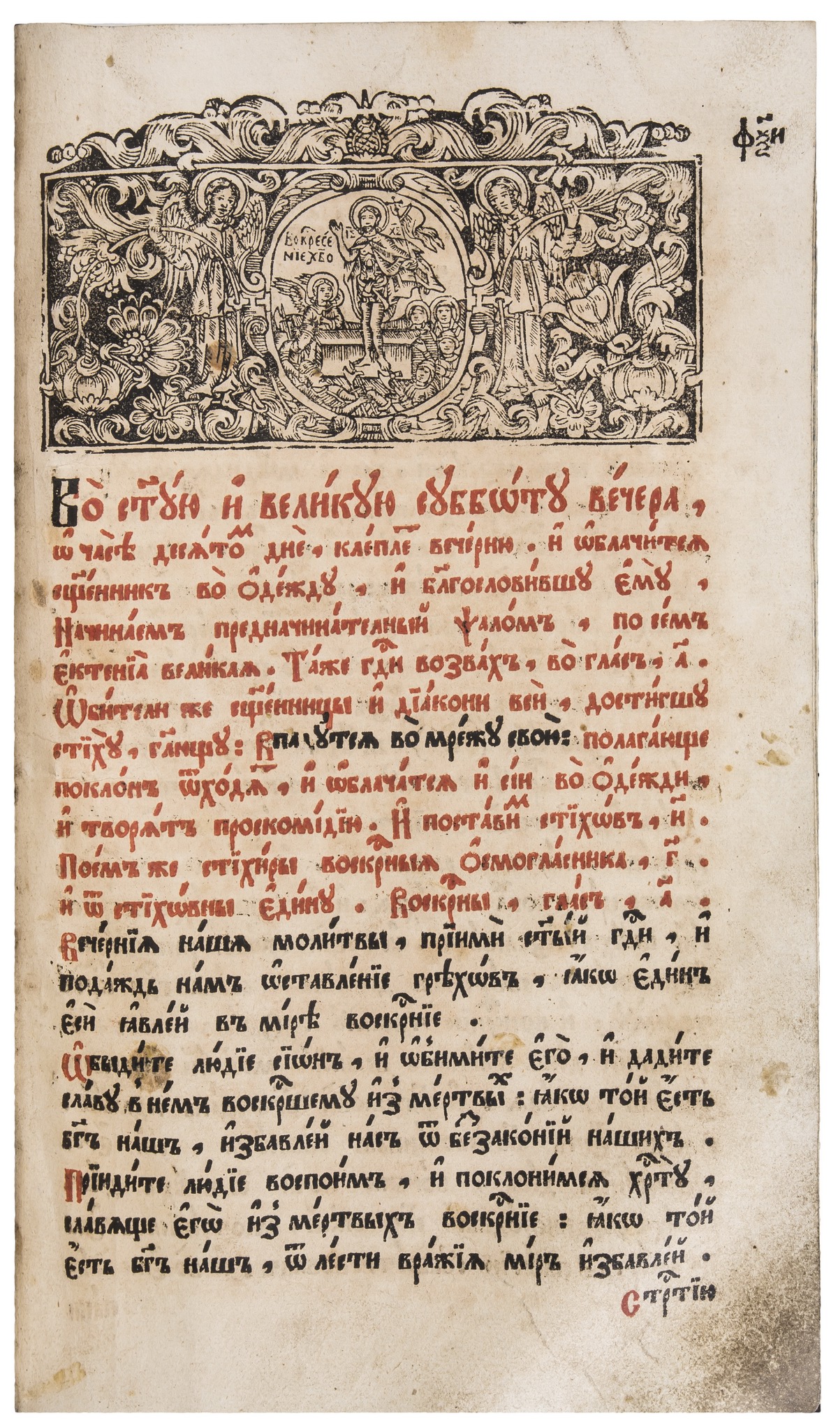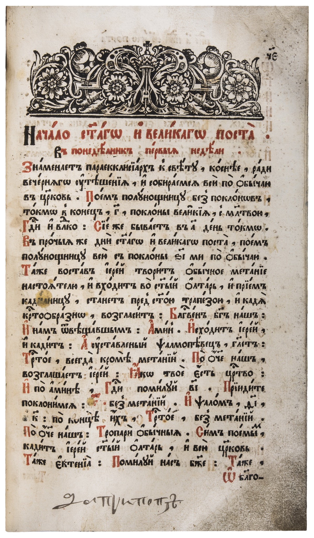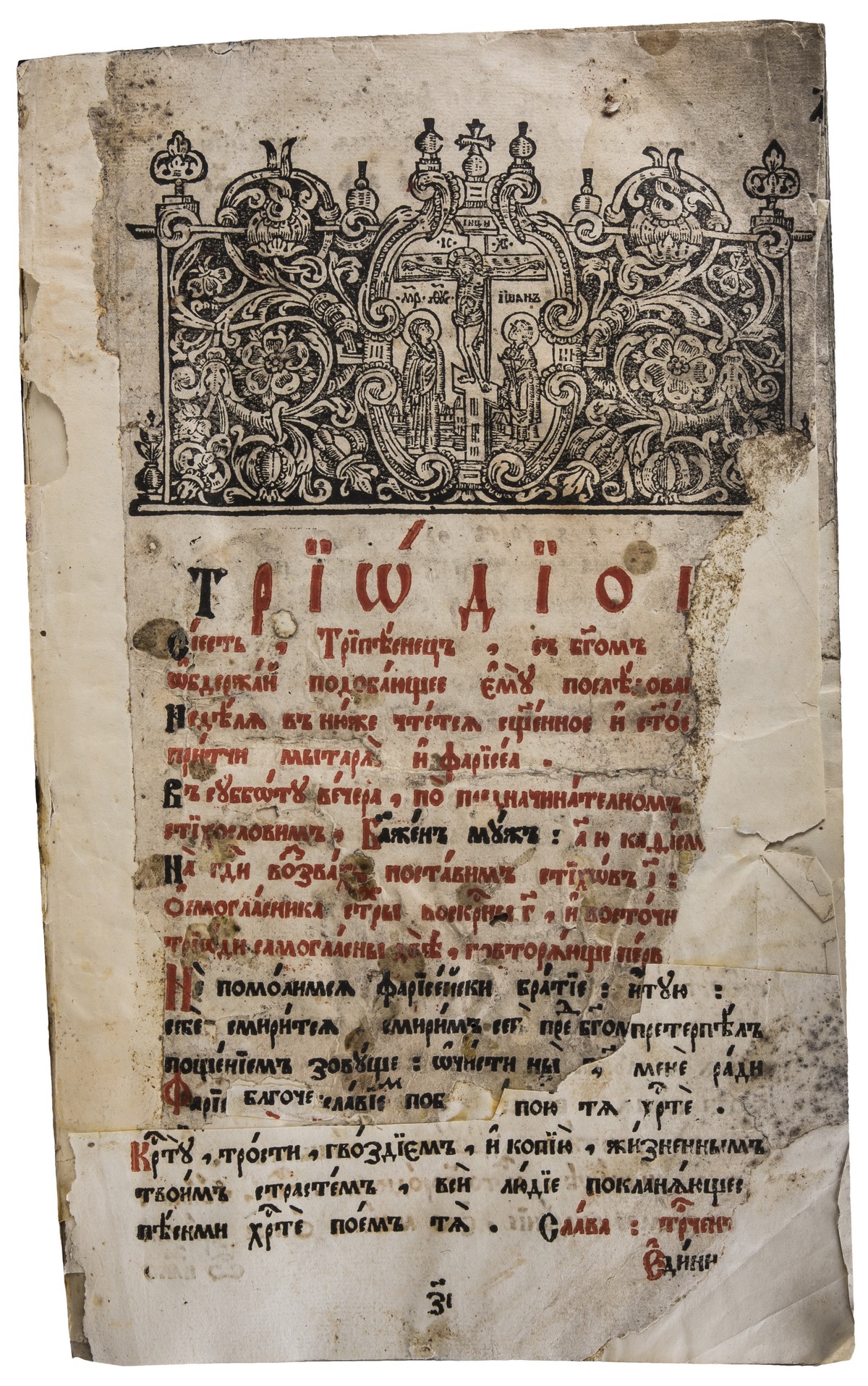 Переплет конца XVIII-нач. XIX вв. (цельнокожаный с тиснением по корешку; сохранились фрагменты корешка и задняя крышка, ослаблена). Тройной крапчатый обрез. Строк 28. Фолиация на верхнем поле лицевой стороны листа справа. Печать в две краски. Орнамент: заставки, концовки. Владельческая надпись скорописью на листах в области нижнего колонтитула (встречается с 4 по 150 лист с перодическими пропусками листов): «Месяца / февраля / в 20 день / положили / сию / книгу / Триодион / в церковь / <....> / ». Упоминается деревня Лепихино и фамилия Готовцевых.