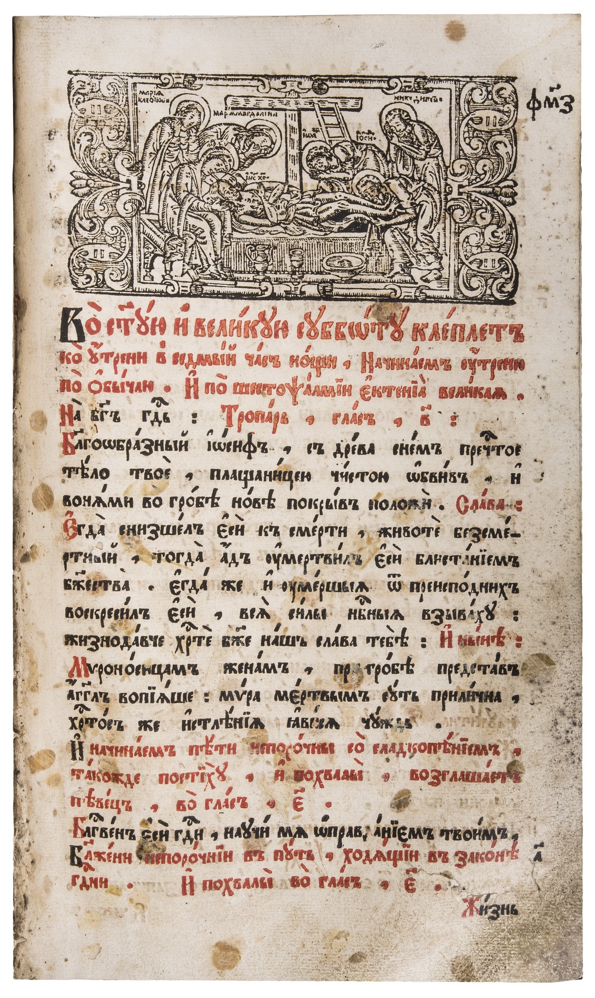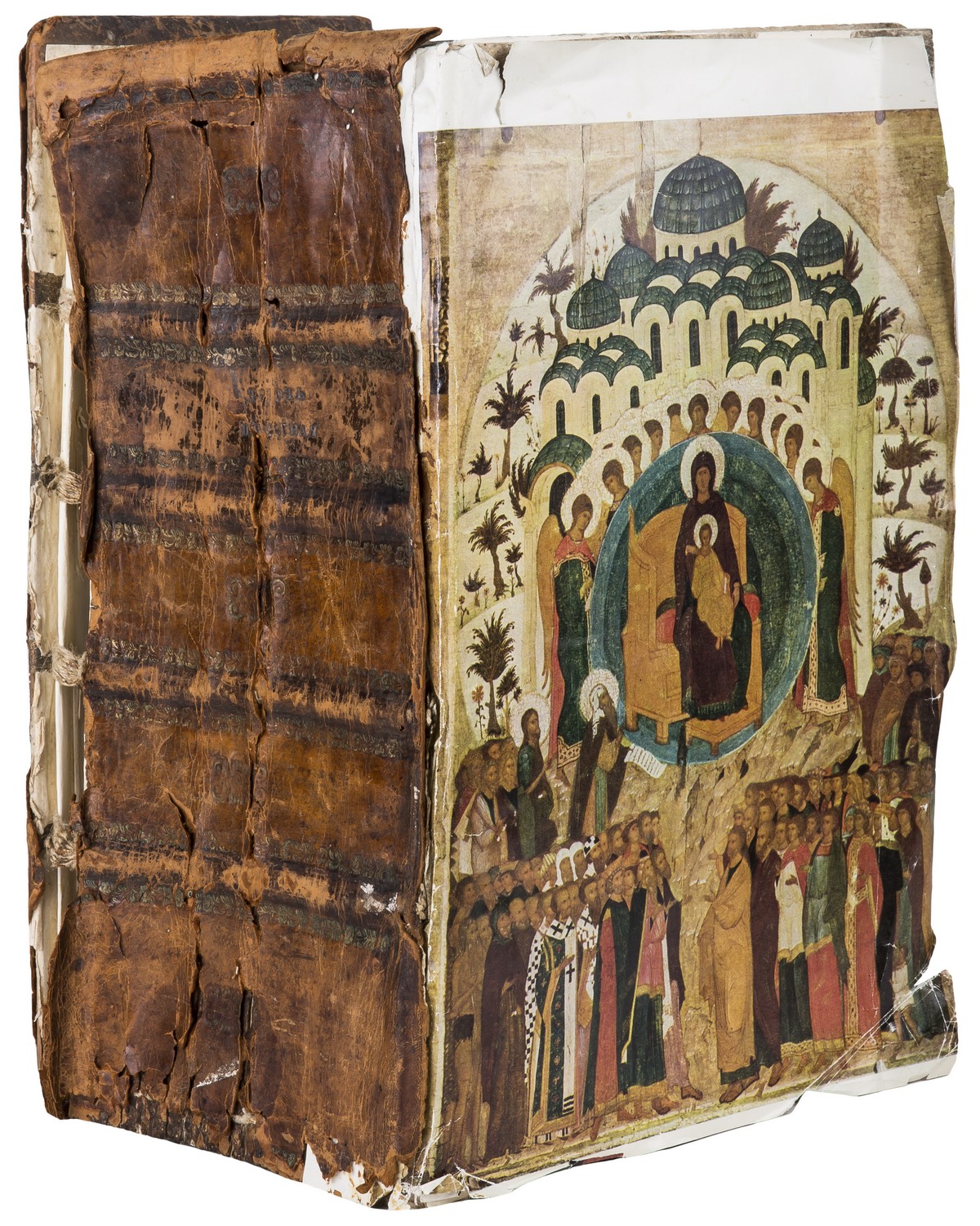 Утраты фрагм. перепл. (в т.ч. пер. крышки). Корешок укреплен фрагм. владельческой репродукции. Следы влаги. Блок слегка подрезан под переплет. Первый лист с утратами, дублирован, второй л. с утратами и любит. восстановл. Отсутств. лл. 129, 214, 516, 517. Восстан. ок. трети лл. (текст или изобр. задеты), значит. восстан. 3 лл. (текст и изобр. задеты на треть и более), частые неб. восстан. и урепл. (текст не задет).