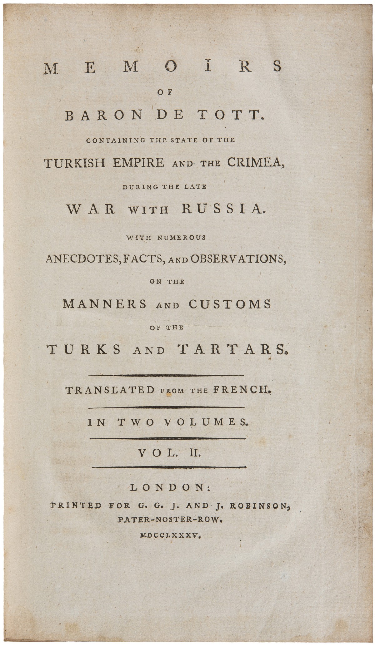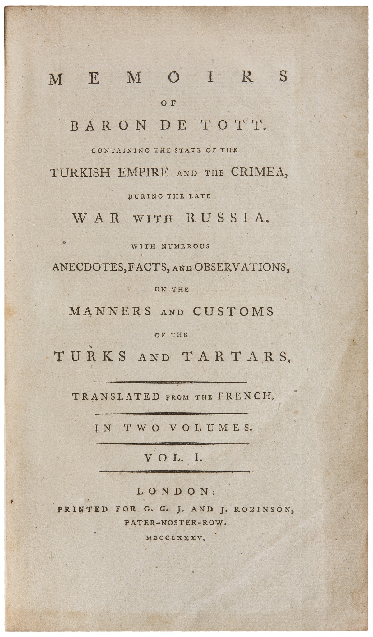 На основе этих лет службы, им были изданы «Воспоминания барона де Тотта о турках и татарах» — что примечательно, впервые опубликованные в Париже в 1784 году, сразу вскоре после присоединения Крыма к Российской империи и последующее резкое повышение интереса Европы к этому региону. «Мемуары» были бестселлером своего времени, активно читавшимся и активно обсуждавшимся на многих европейских языках.