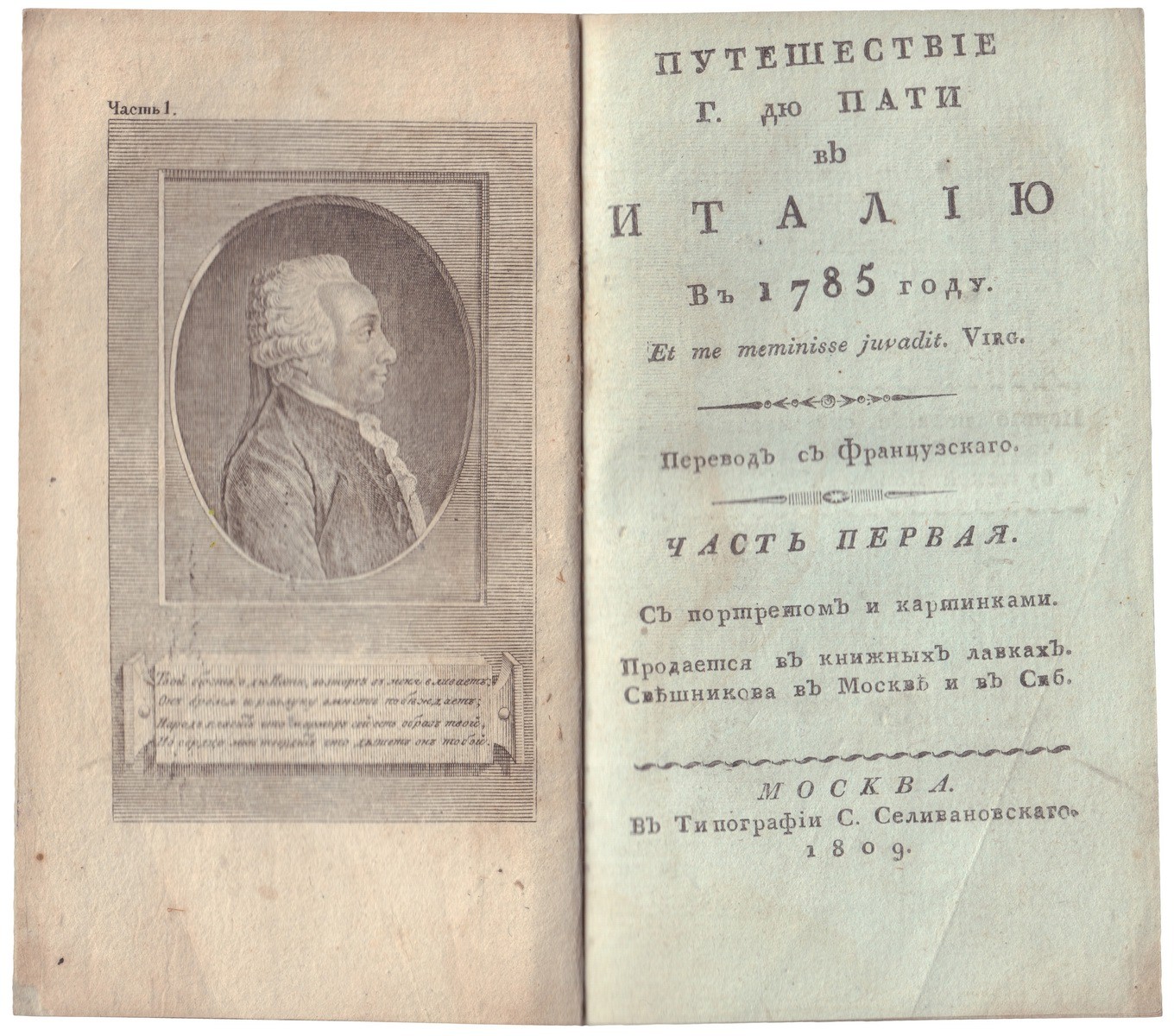 Шарль Маргерит Дюпати (1746-1788) — юрист и литератор. СК 1801-1825. № 2538; Геннади, 2. с. 294; Обольянинов. № 830; Плавильщиков. № 3534; Сопиков. № 9188; Межд. Книга, каталог № 11 «Русская антикварная книга». № 147.