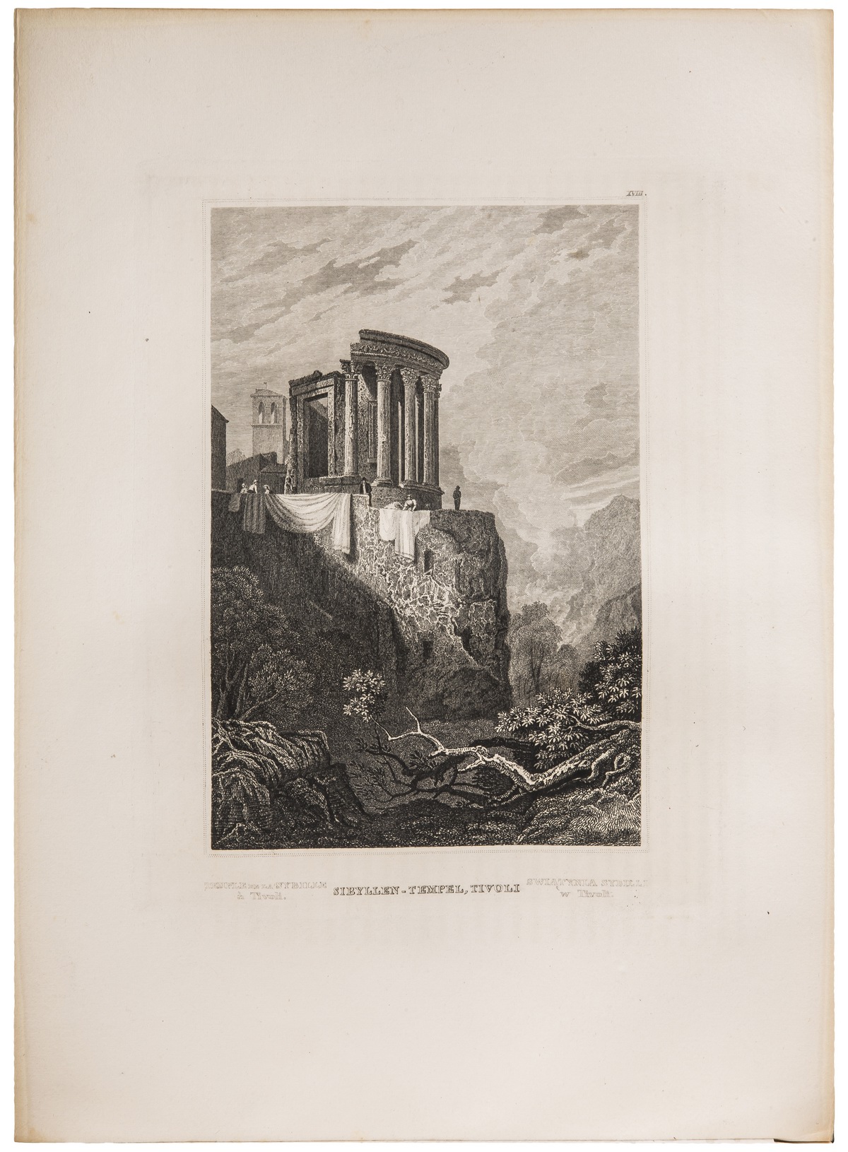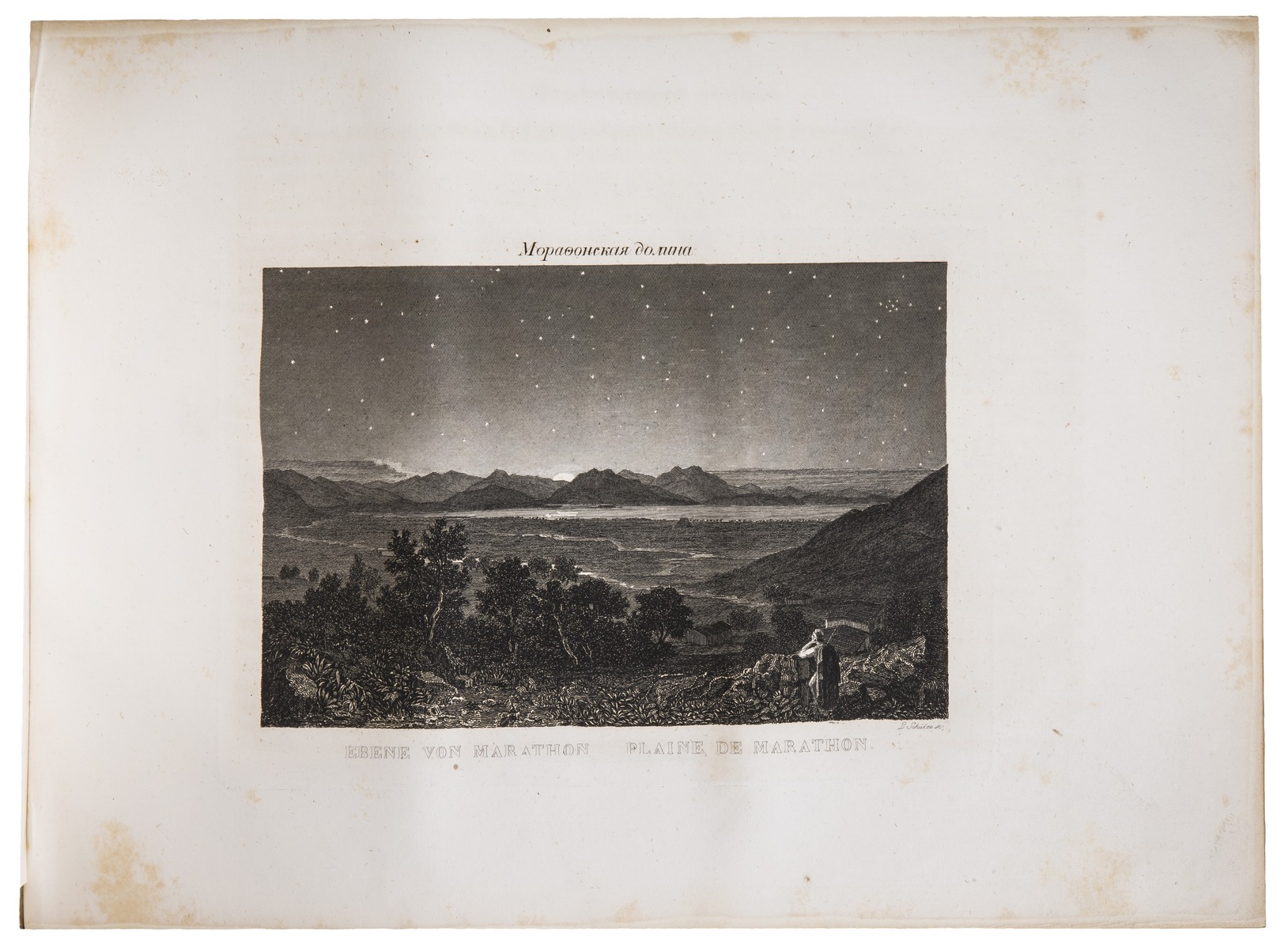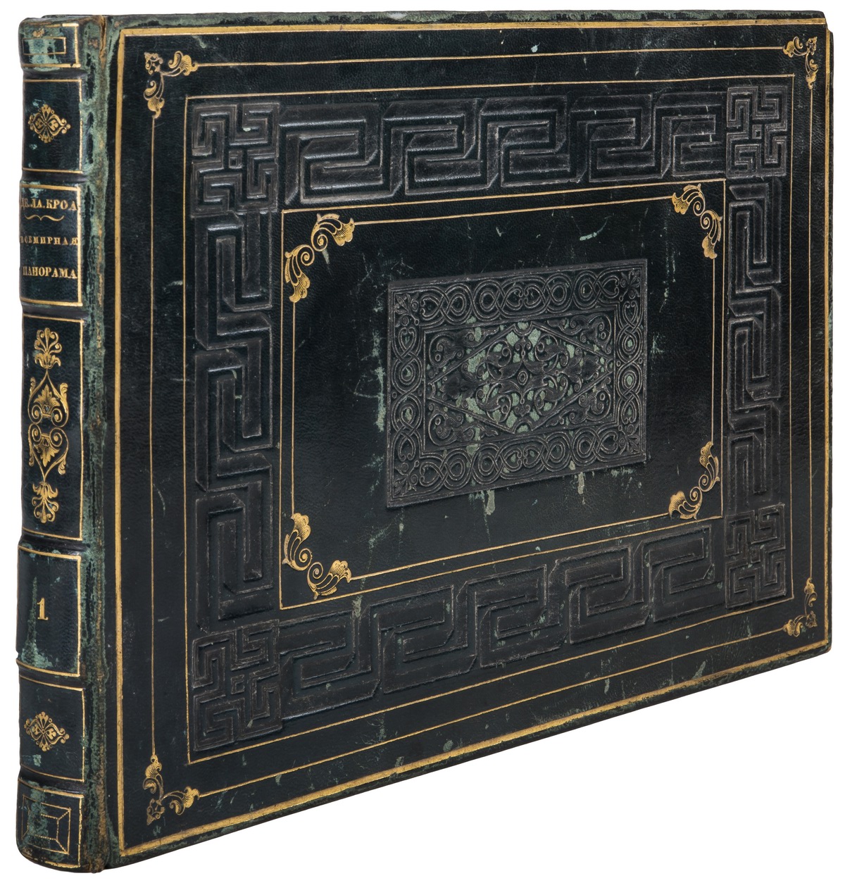 В цельнокожаном переплете с художественным золототым и блинтовым тиснением по крышкам и корешку. Форазцы оклеены бумагой «под муар» с орнаментальными рамками сухого тиснения. Тройной золотой обрез. Золотая дублюра. Влад. бум. сюжетный экслибрис на форз. 48 полностраничных видовых гравюр резком и офортом. Комплект иллюстраций.