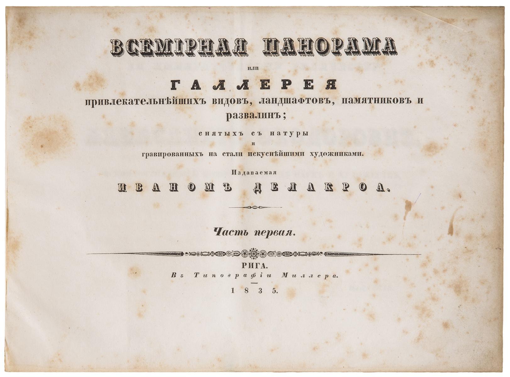 Издание выходило тетрадями — по 12 тетрадей в каждой части. Первая часть содержит заметки и виды Константинополя, Индии («Кутаб-Минар в Дели», «Тадж-Махал в Агре»), Англии и Шотландии («», «Оксфорд», «Эдинбургский замок»), Испании, Германии, Швейцарии и Голландии («Цинтра в Лиссабоне», «Луго», «Карлсруэ», «Шаффхаузен», «Юнгфрау», «Телева молельня в Бурглен», «Амстердам»), Соединенных Штатов Америки («Капитолий», «Нью-Хейвен»), Италии («Храм Сивиллы В Тиволи», «Флоренция»), Греции («Корфу», «Афины», «Парфенон», «Марафонская долина», «Афинский Акрополь») и т.д. «...путешественник найдет во Всемирной Панораме верные и отчетливейшим исполнением отличающиеся снимки описанных видов; историк — краткие описания всего того, что летописи о них повествуют; живописец — желаемые, может быть, сюжеты, для творческой кисти своей; любитель чудес и рассказов — народные предания, особенно о живописных развалинах рыцарских замков, с древних времен поныне сохранившихся; а пленяющиеся красотою пластического искусств — прекрасные произведения кисти и резца». Редкость. Обольянинов № 432.