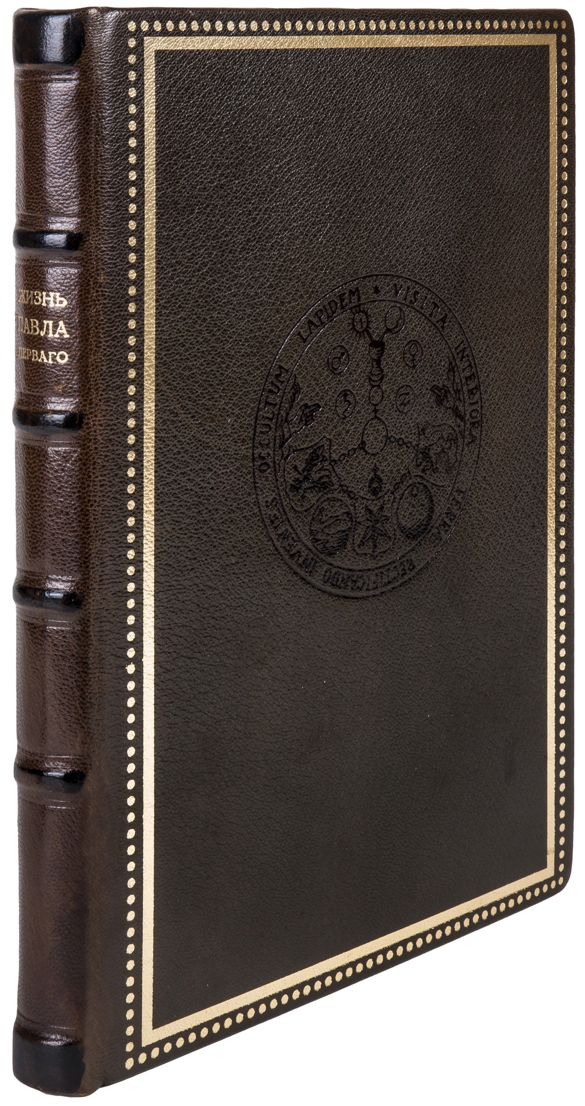 В цельнокожаном владельческом переплете, стилизованном под переплеты эпохи. Тиснение золотом по крышкам и корешку с объемными бинтами. На передней крышке тиснена масонская эмблема V.I.T.R.I.O.L. «Visita Interiora Terraе Rectificando Invenies Occultum Lapidem» (лат.: Посети недра земли, и очищением обретёшь сокрытый камень). Золотая дублюра. Тройной тонированный обрез. Форзацы оклеены муаровой (?) тканью.