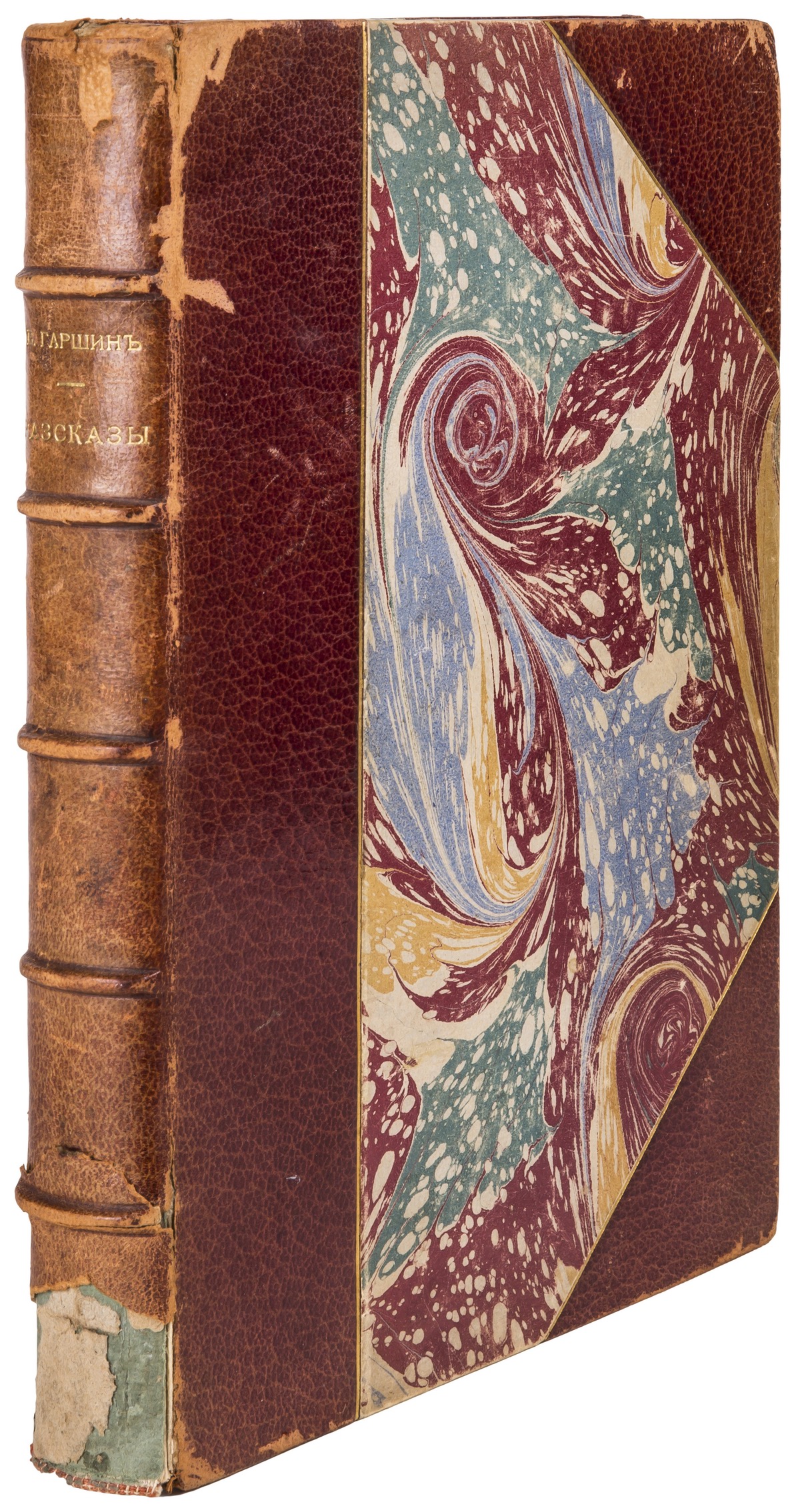 В полукожаном переплете эпохи с золотым тиснением по корешку с объемными бинтами. Форзацы оклеены бумагой «под мрамор» с узором «французский завиток». Торшонированный обрез. Золотая «головка».