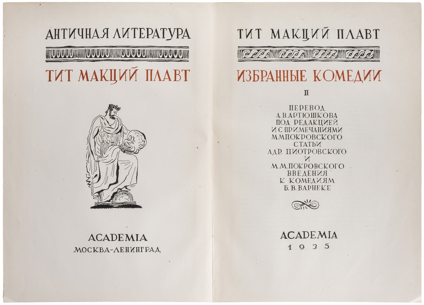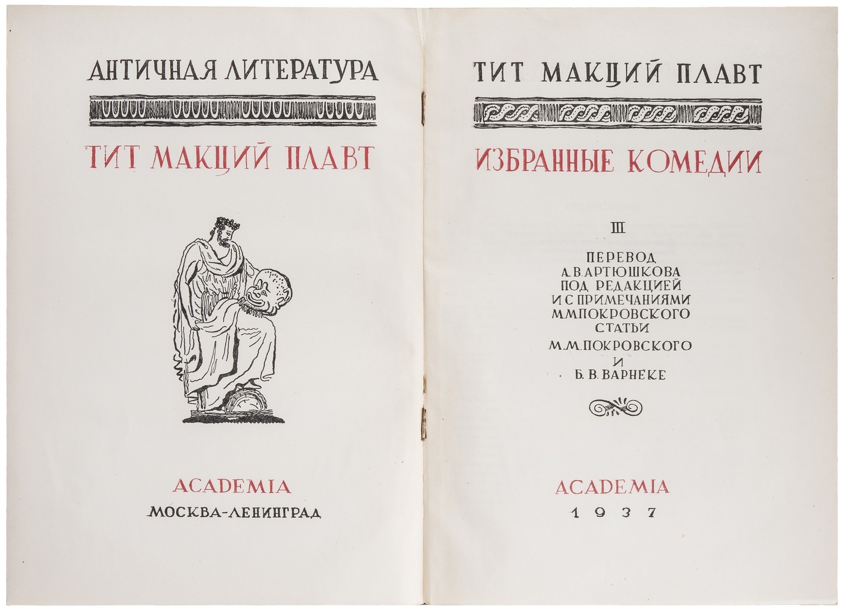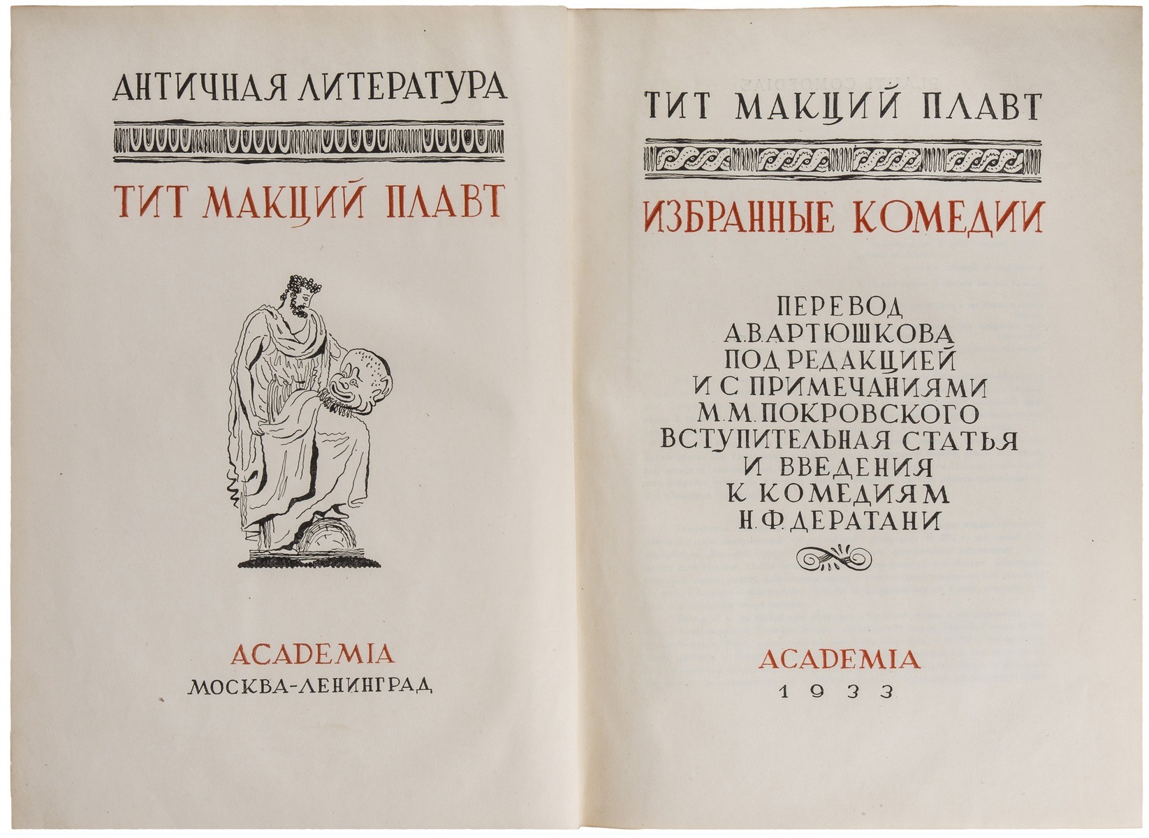 Плавт Тит Макций (ок. 254 до н. э. — 184 до н. э.) — выдающийся римский комедиограф, мастер паллиаты. Написал около 130 комедий, из которых сохранилось 20. Единственный полный (кроме фрагментов) перевод комедий Плавта на русский язык выполнен А.В. Артюшковым. «Academia» № 567, 757, 911.