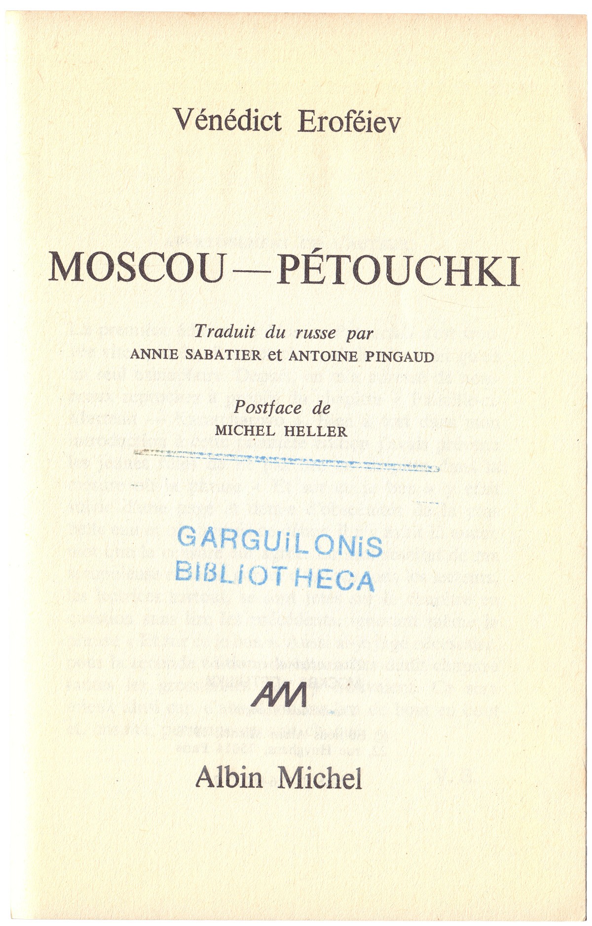 «La démesure de Rabelais, l'acuité de Gogol, la cruauté pathétique de Kafka se retrouvent dans Moscou-Pétouchki, un grand livre du Samizdat» (Из текста синопсиса. Прим. пер.: "Чрезмерность Рабле, острота Гоголя, жалкая жестокость Кафки встречаются в "Москве-Петушках", главной книге самиздата"). Автор послесловия — Михаил Яковлевич Геллер (фр. Michel Heller), историк, публицист, писатель, критик, диссидент.