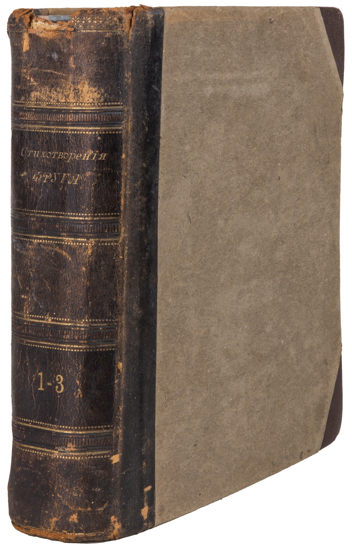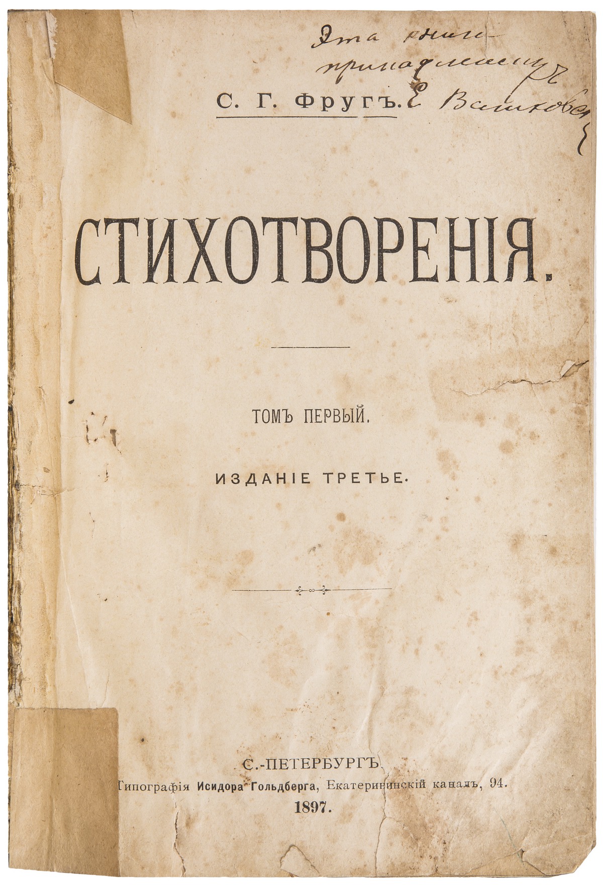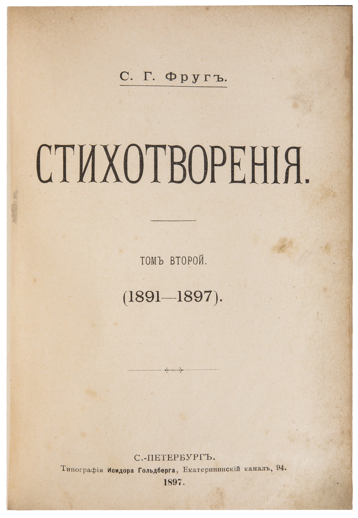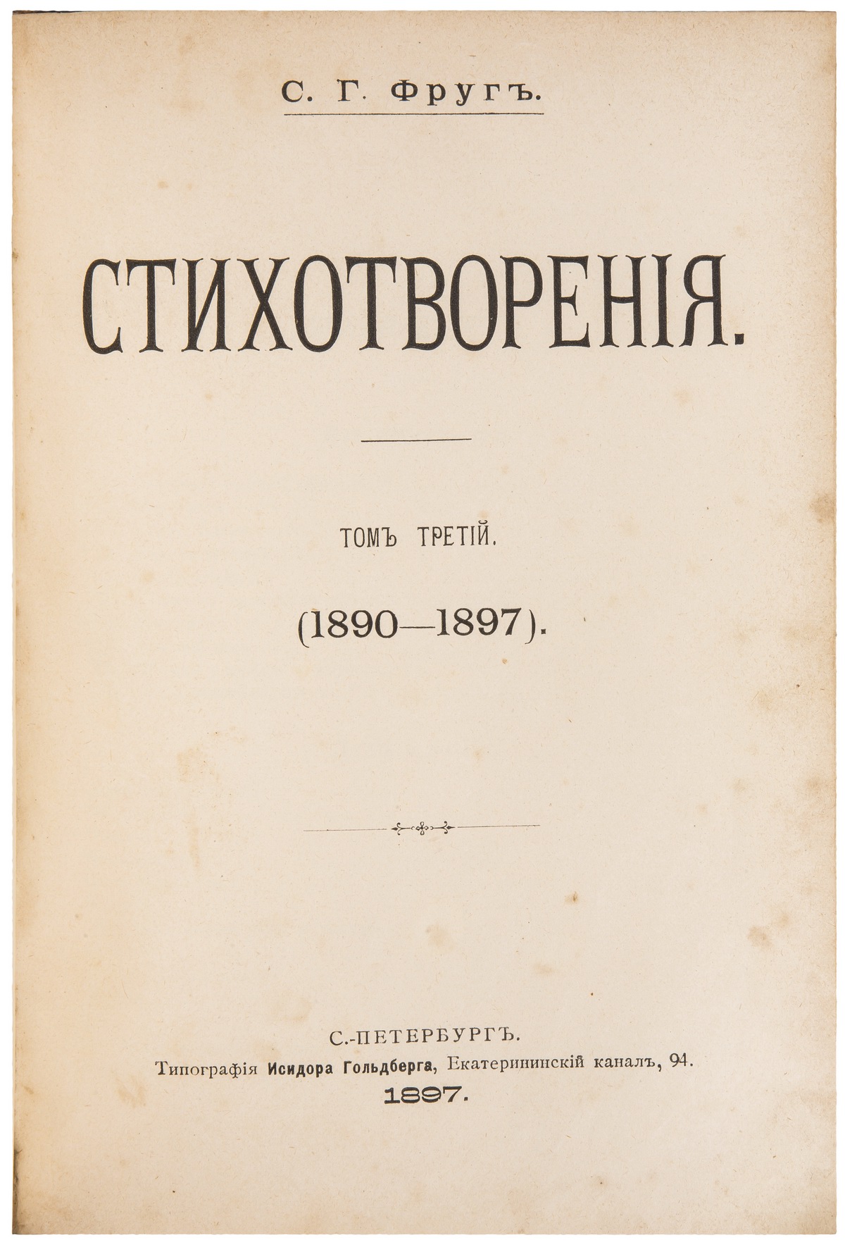 Прилагается сборник стихотворений Семена Фруга, датированный 1897 же годом: Фруг, С.Г. Стихотворения / С.Г. Фруг. - 3-е изд. - СПб.: тип. И. Гольдберга, 1897. - 3 т. (1 кн.); 21,1х14,7 см. Т. 1. - 1897. - VIII, 3-318 с.; Т. 2 : (1891-1897). - 1897. - IV, 288 с.; Т. 3 : (1890-1897). - 1897 (обл. 1898). - [2], IV, 256, VIII с. В полукожаном переплете эпохи с тиснением золотом по корешку.