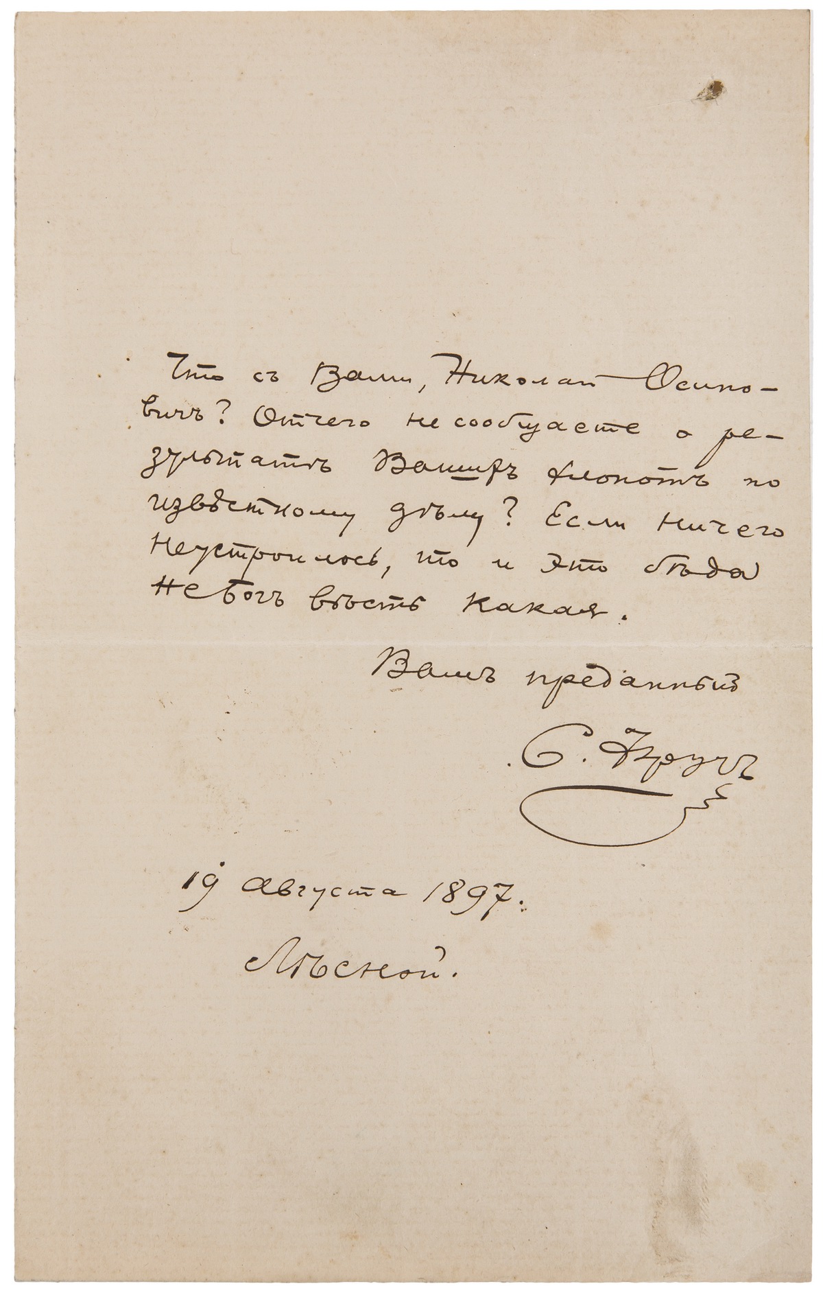 Записка с текстом, написанным рукой Семена Григорьевича Фруга и датированным 1897 годом: «Что с Вами, Николай Осипо- / вич? Отчего не сообщаете о ре- / зультате Ваших хлопот по / известному делу? Если ничего / неустроилось, то и это беда / не Бог весть какая. / Ваш преданный / С. Фруг / 19 августа 1897 / Лесной». Состояние записки отличное. След сгиба по центру листа.