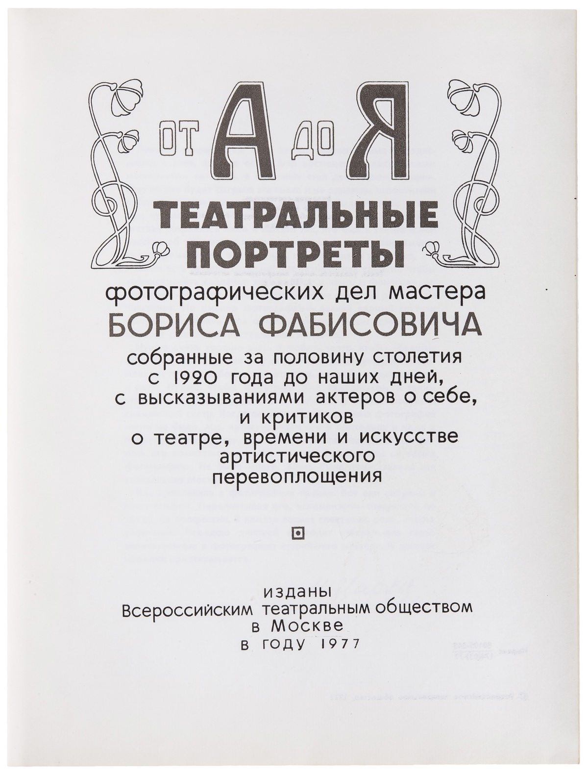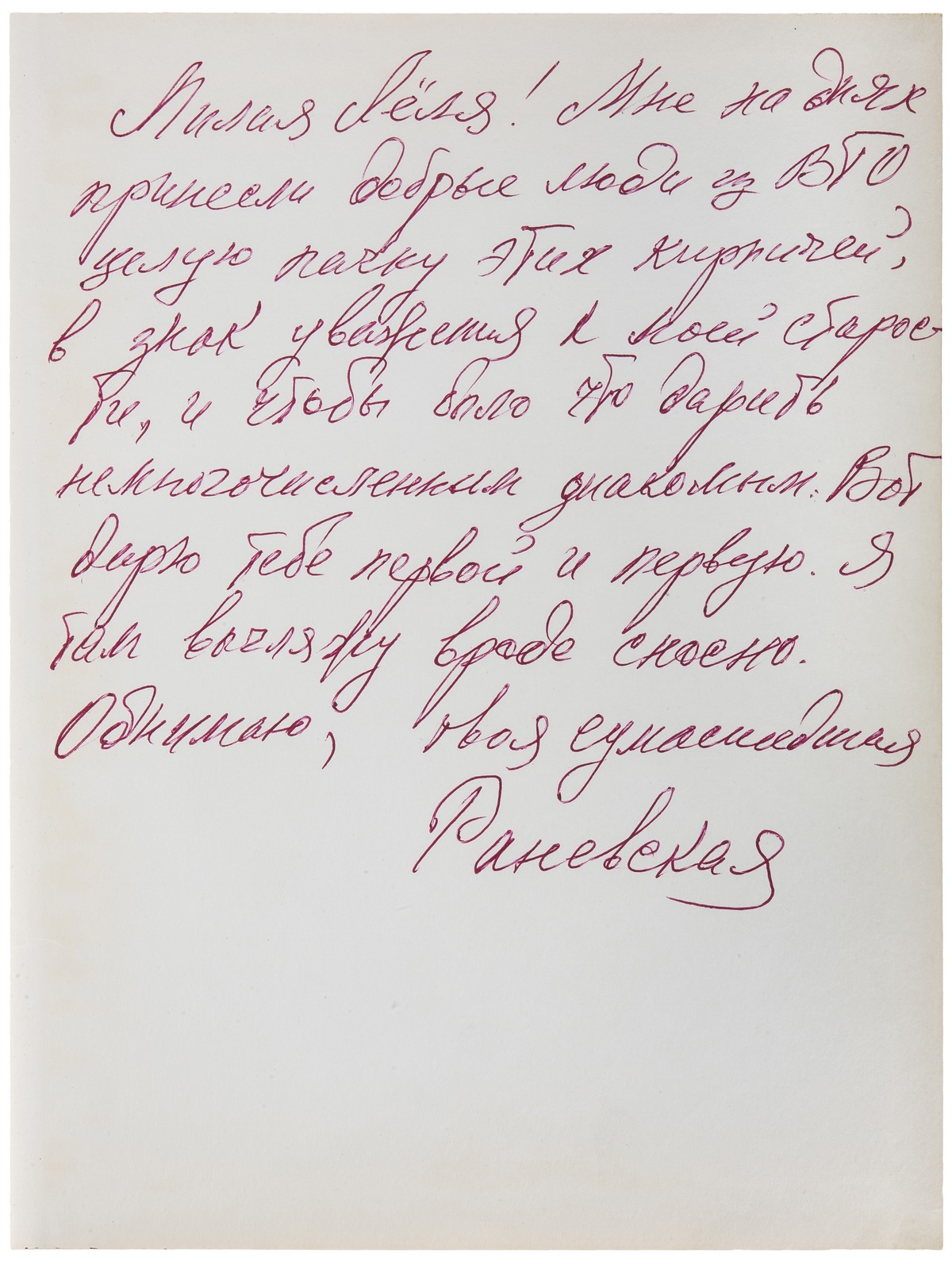 Собственноручная дарственная надпись Фаины Раневской на своб. л. форз.: «Милая Лёля! Мне на днях / принесли добрые люди из ВТО / целую пачку этих кирпичей, / в знак уважения к моей старос- / ти, и чтобы было что дарить, / немногочисленным знакомым. Вот / дарю тебе первой и первую. Я / там выгляжу вроде сносно. / Обнимаю, твоя сумасшедшая / Раневская».