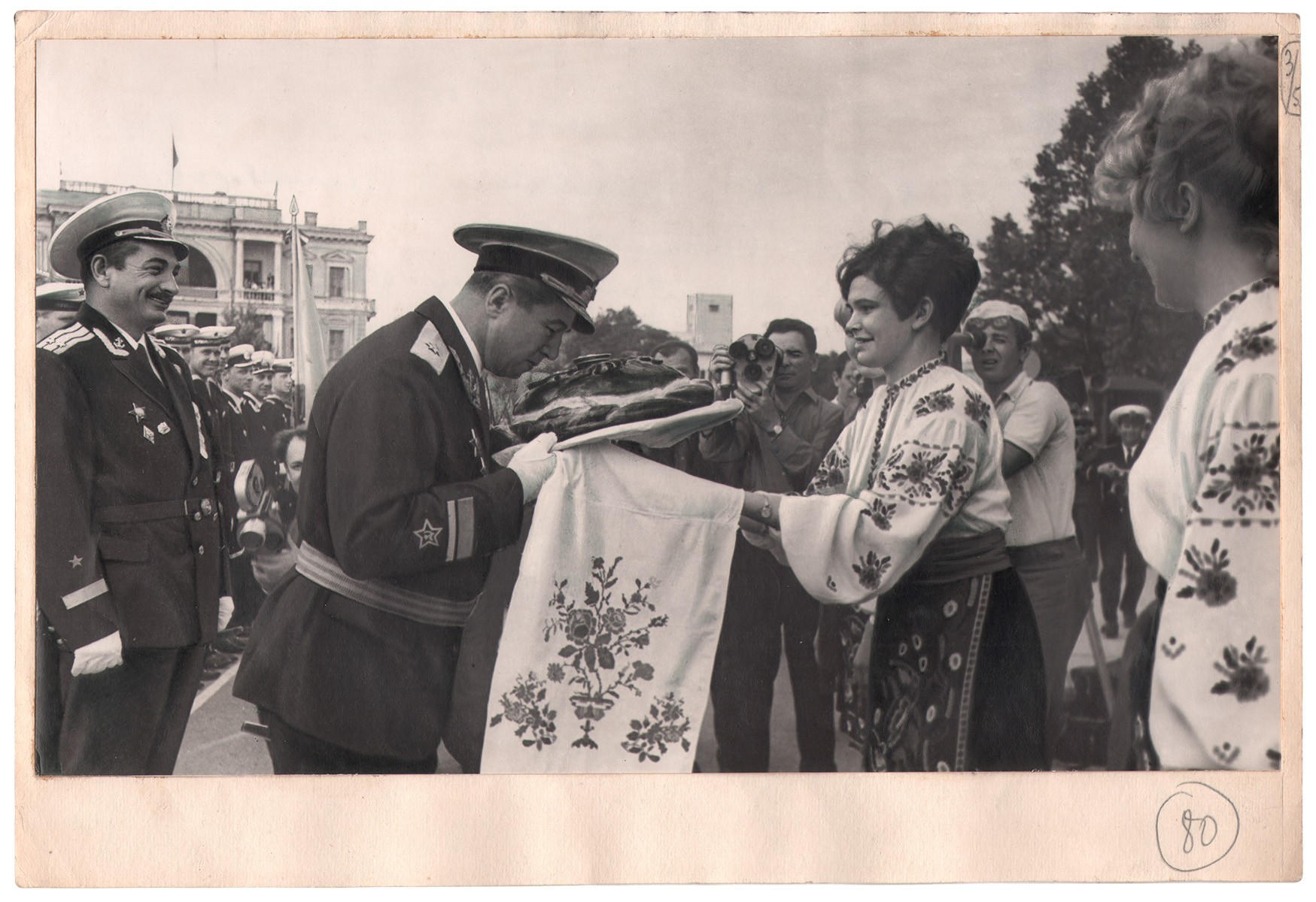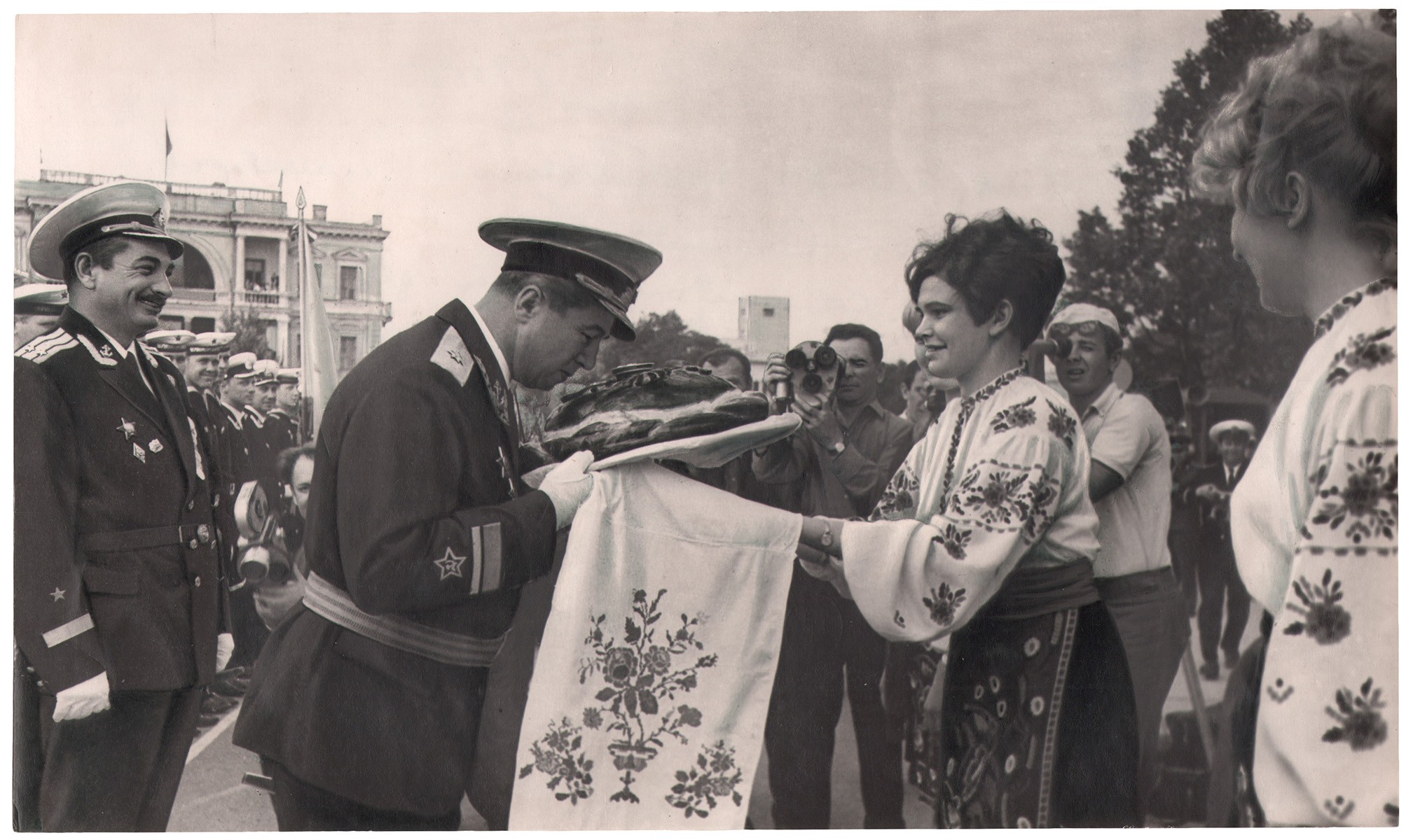 Фотография «Контр-адмирал С.С. Соколан принимает хлеб-соль от жителей Севастополя». - 1970. Оригинальный отпечаток. - 16х27 см.