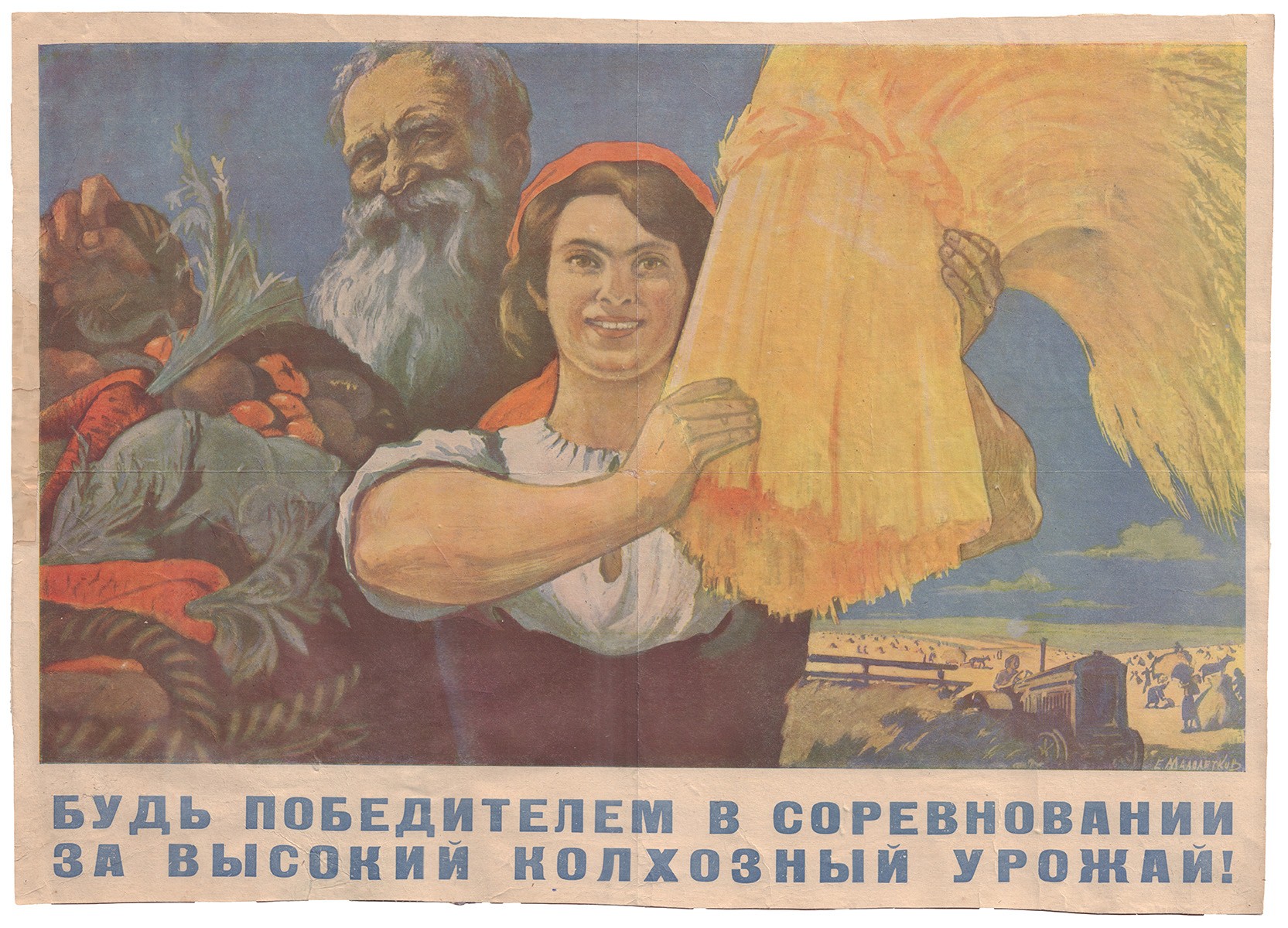 Малолетков Евгений Степанович (1915–1961) - советский художник, график, карикатурист, плакатист. Учился в студии М. Леблана, затем в 1930-х годах – в художественной студии Всекохудожника у И. Ф. Рерберга, в конце 1930-х – начале 1940-х – в Московском государственном художественном институте (МГХИ) на отделении повышения квалификации художников книги и графики у Михаила Ивановича Курилко. В середине 1930-х годов работал художником в бюро рекламы Наркомпищепрома, занимался оформлением кондитерских и других изделий. Он автор эскиза обертки конфет «Снегурочка» (1934–1936). Художник «Воениздата» (1936–1941, с 1944 года). К этому времени относится один из первых его плакатов, посвящённый достижениям в сельском хозяйстве – «Будь победителем в соревновании за высокий колхозный урожай!» (1944).