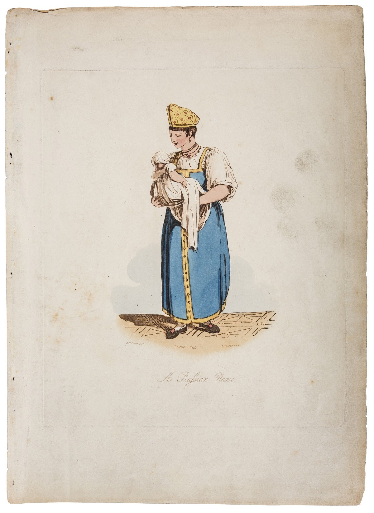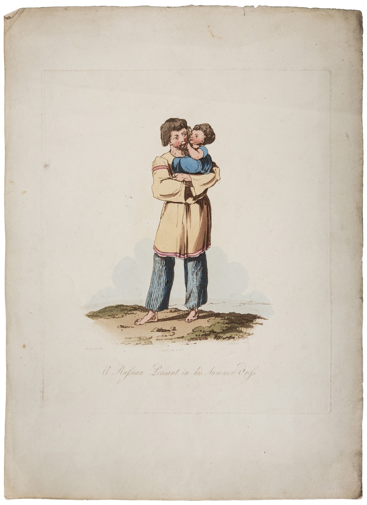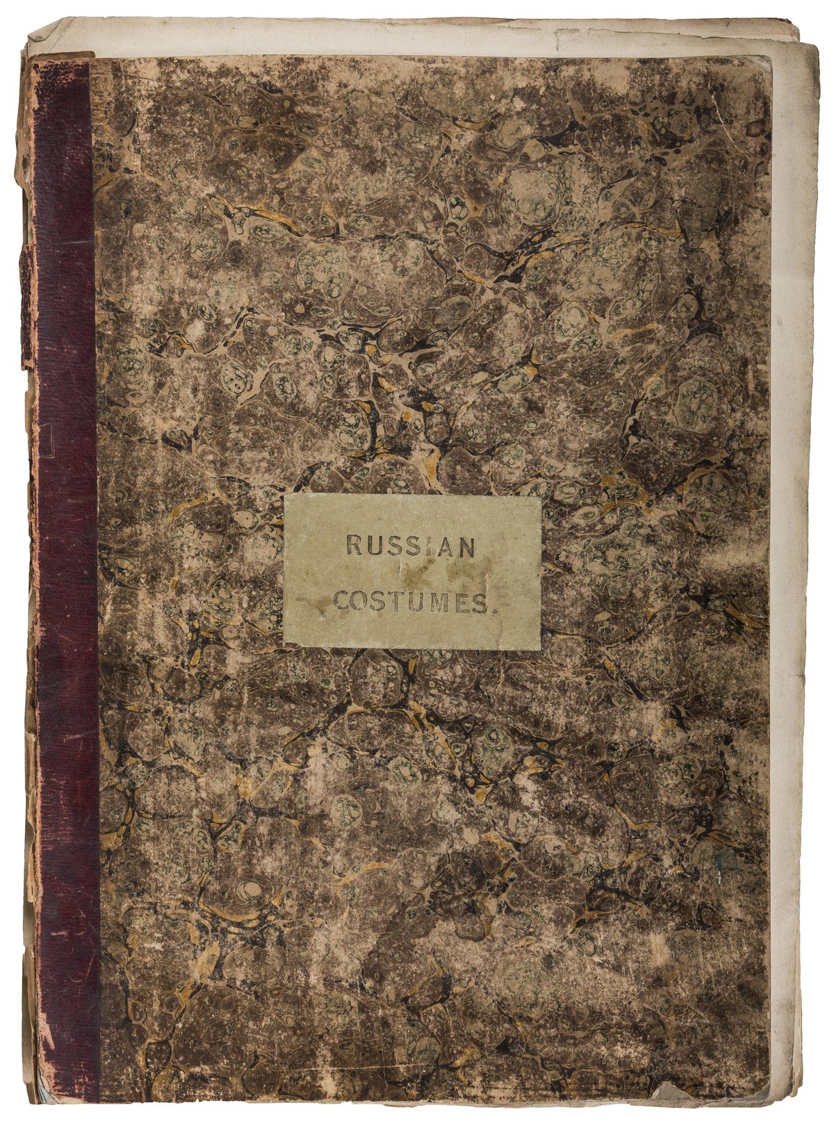 Во владельческом картонажном переплете с этикеткой на пер. крышке. Альбом содержит раскрашенные акварелью гравюры в технике акватинты. Гравюры выполнены Джозефом Константином Стэдлером (Joseph Constantine Stadler) с работ сэра Роберта Кера Портрета, которые вошли в издание «Путевые зарисовки России и Швеции...» (Р. Портер, 1809). Приведены изображения крестьян, церковнослужителей, отдельных народов (цыгане, калмыки), военных (донские казаки, уральские казаки, гвардия) и т.д.