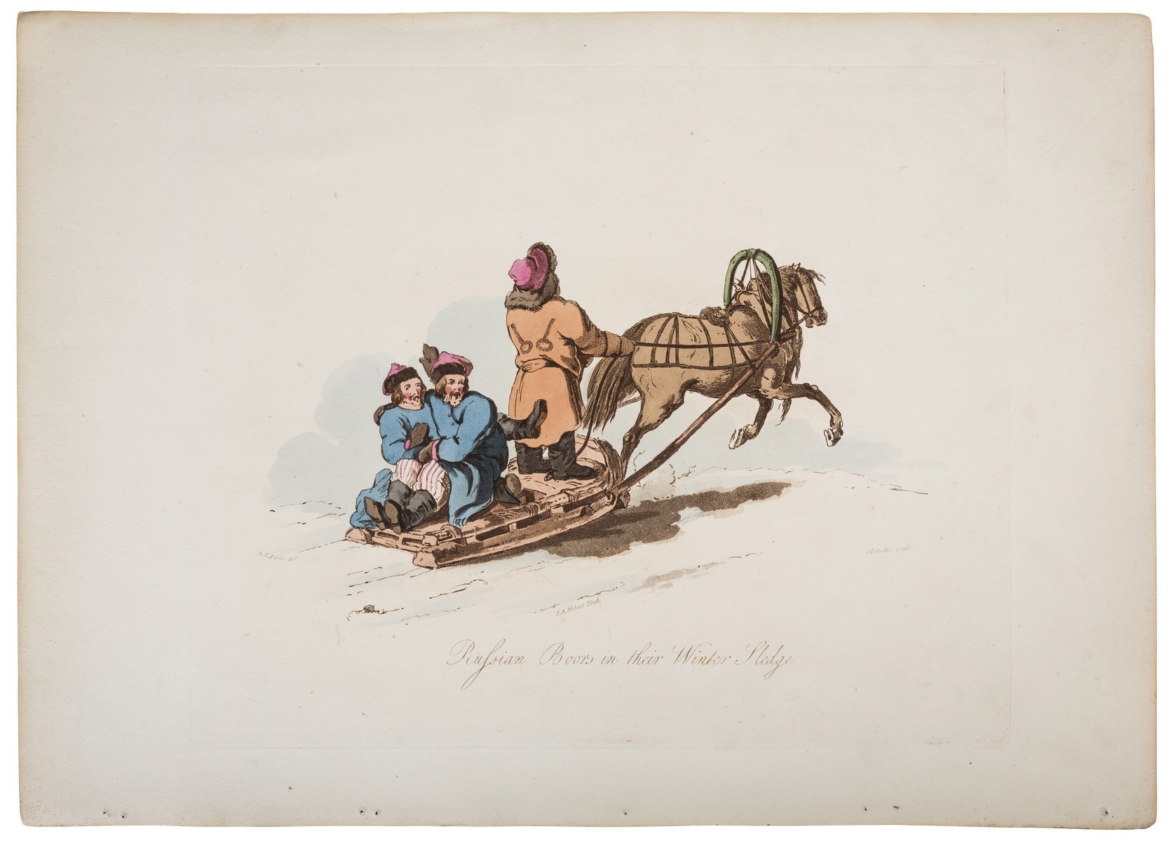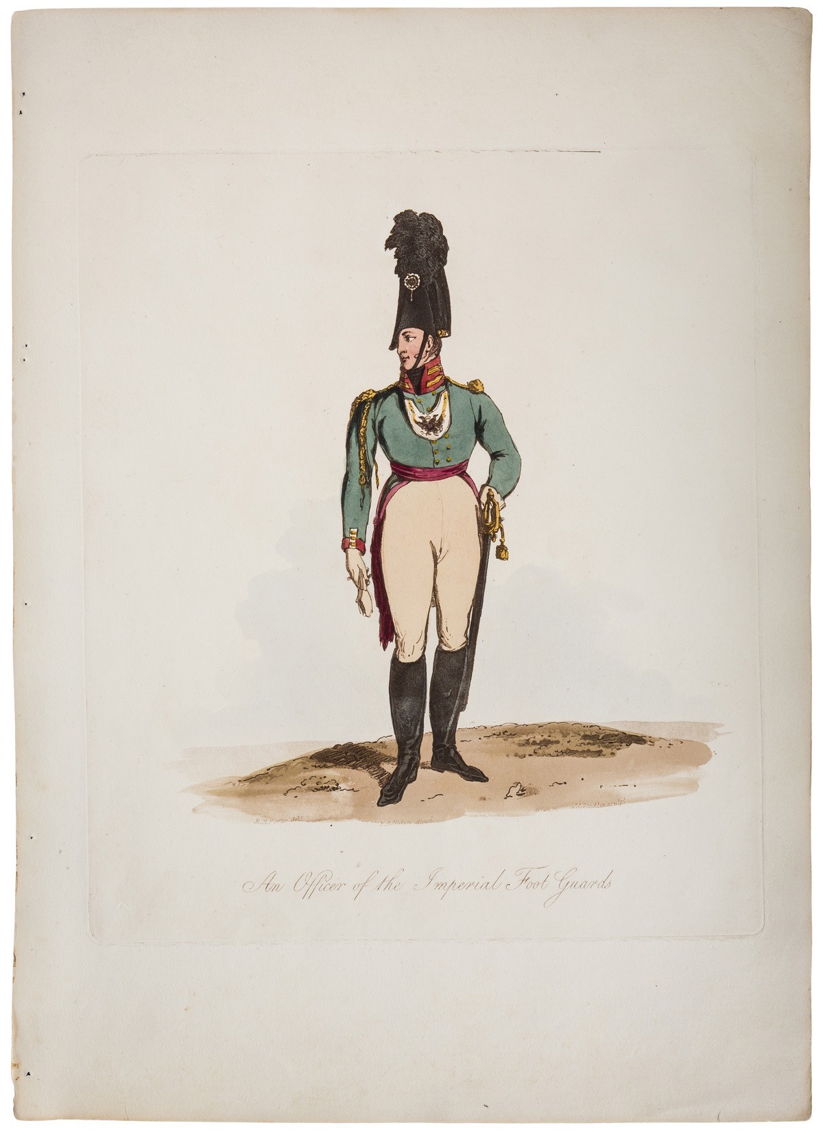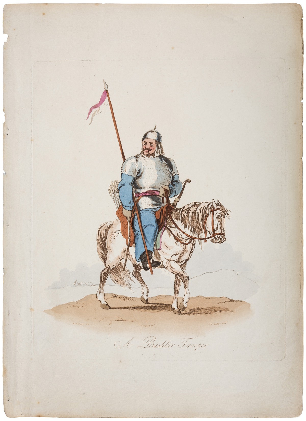 Во владельческом картонажном переплете с этикеткой на пер. крышке. Альбом содержит раскрашенные акварелью гравюры в технике акватинты. Гравюры выполнены Джозефом Константином Стэдлером (Joseph Constantine Stadler) с работ сэра Роберта Кера Портрета, которые вошли в издание «Путевые зарисовки России и Швеции...» (Р. Портер, 1809). Приведены изображения крестьян, церковнослужителей, отдельных народов (цыгане, калмыки), военных (донские казаки, уральские казаки, гвардия) и т.д.