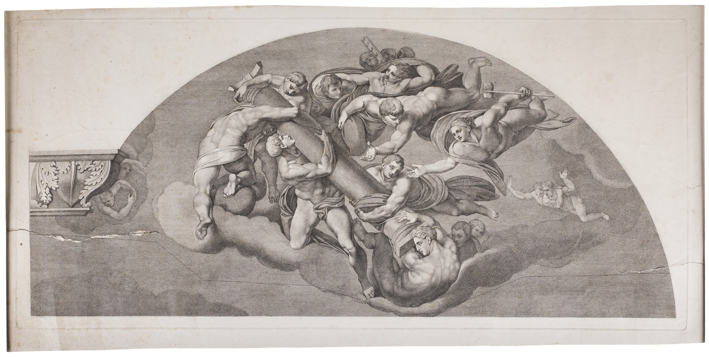 Гравюра из серии шестнадцати работ, составляющих «Страшный суд» Конрада Меца по фреске Микеланджело в Сикстинской капелле. Гравюра воспроизводит правый люнет.