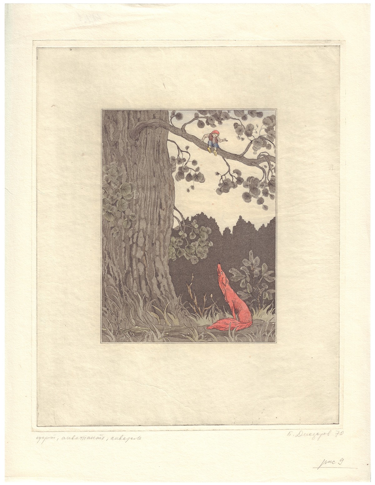 Офорт, акватинта, авторская раскраска. Авторская подпись в правом нижнем углу. Иллюстрация к книге Сельмы Лагерлёф «Чудесное путешествие Нильса с дикими гусями».