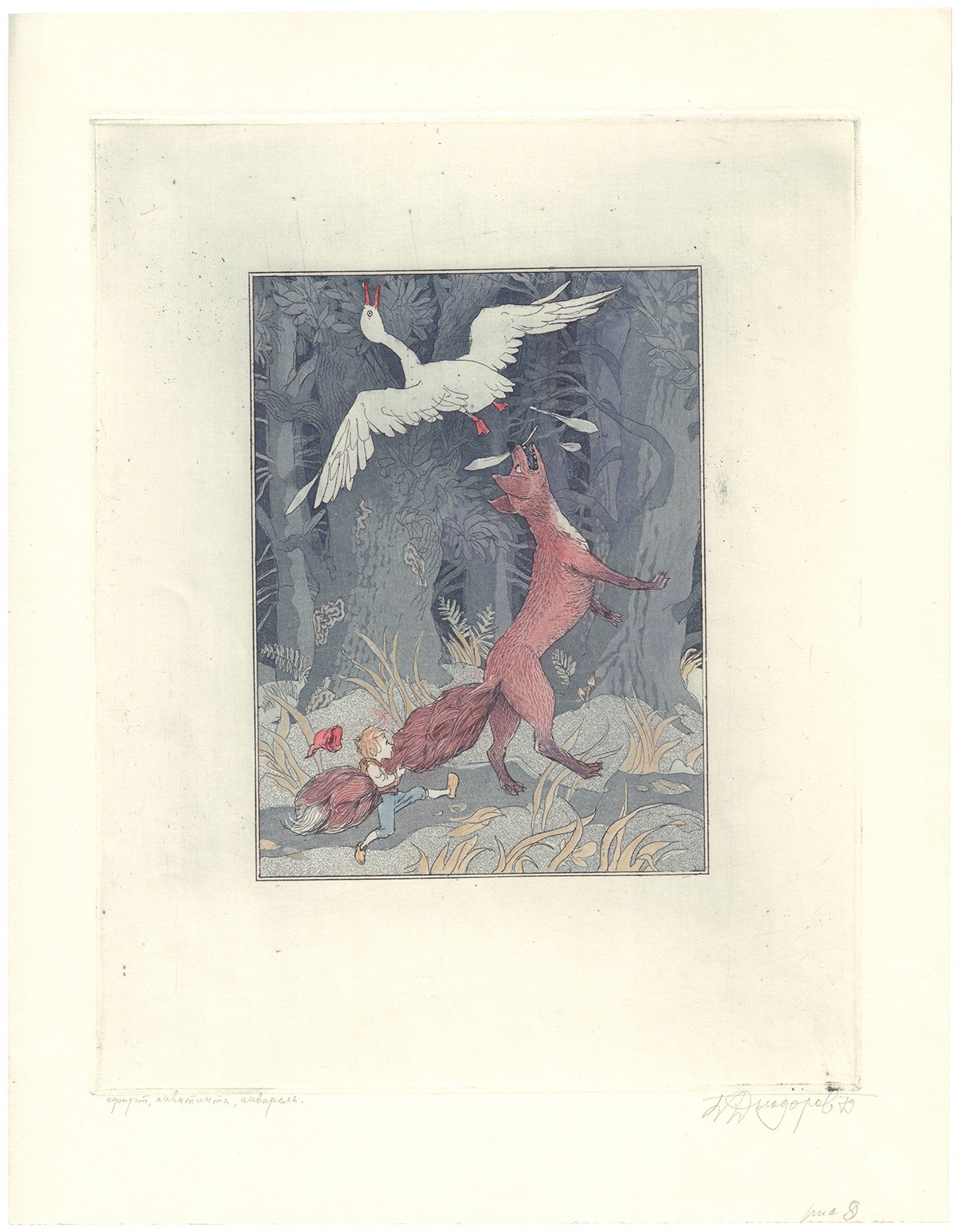 Офорт, акватинта, авторская раскраска. Авторская подпись в правом нижнем углу. Иллюстрация к книге Сельмы Лагерлёф «Чудесное путешествие Нильса с дикими гусями».