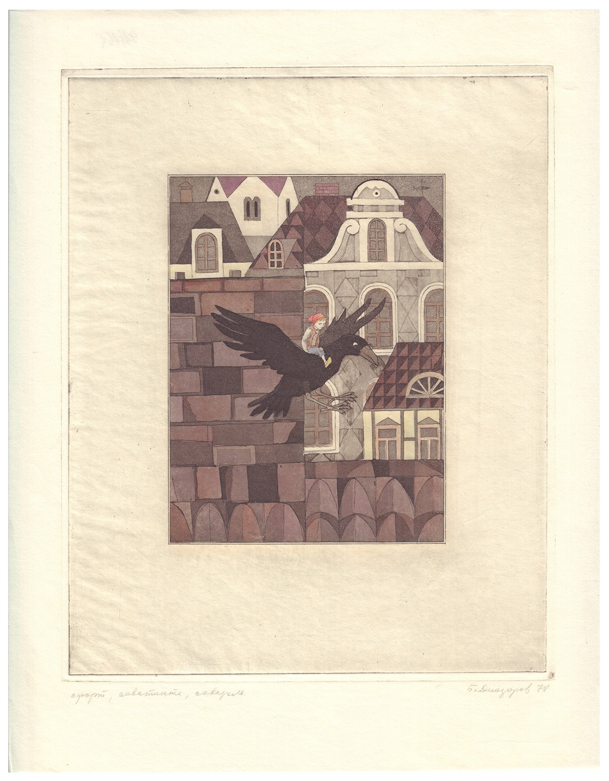 Офорт, акватинта, авторская раскраска. Авторская подпись в правом нижнем углу. Иллюстрация к книге Сельмы Лагерлёф «Чудесное путешествие Нильса с дикими гусями».