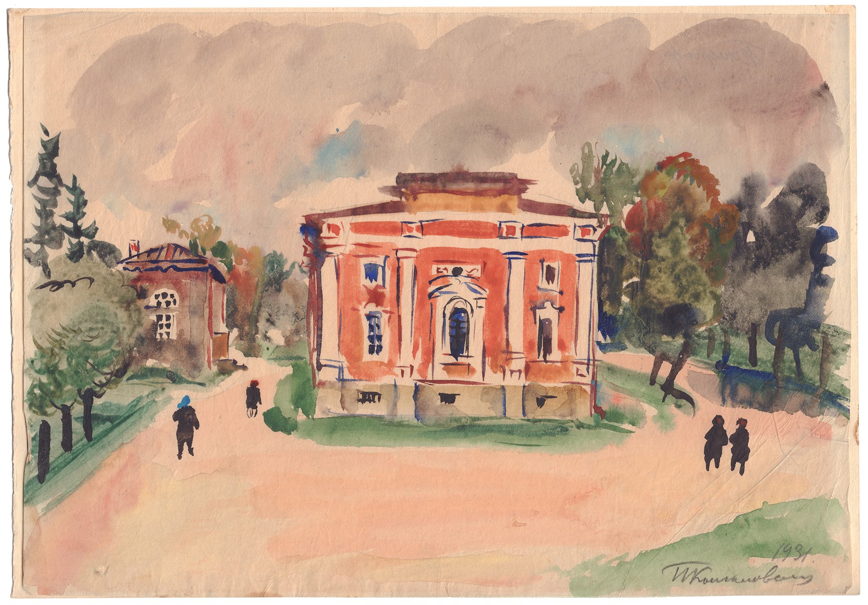 Авторская подпись художника и дата в нижнем правом углу. В 1931 году Петр Петрович Кончаловский едет в Ленинград, где создает серию пейзажей в технике акварели, включая работу «Домик Петра Великого в Летнем саду».