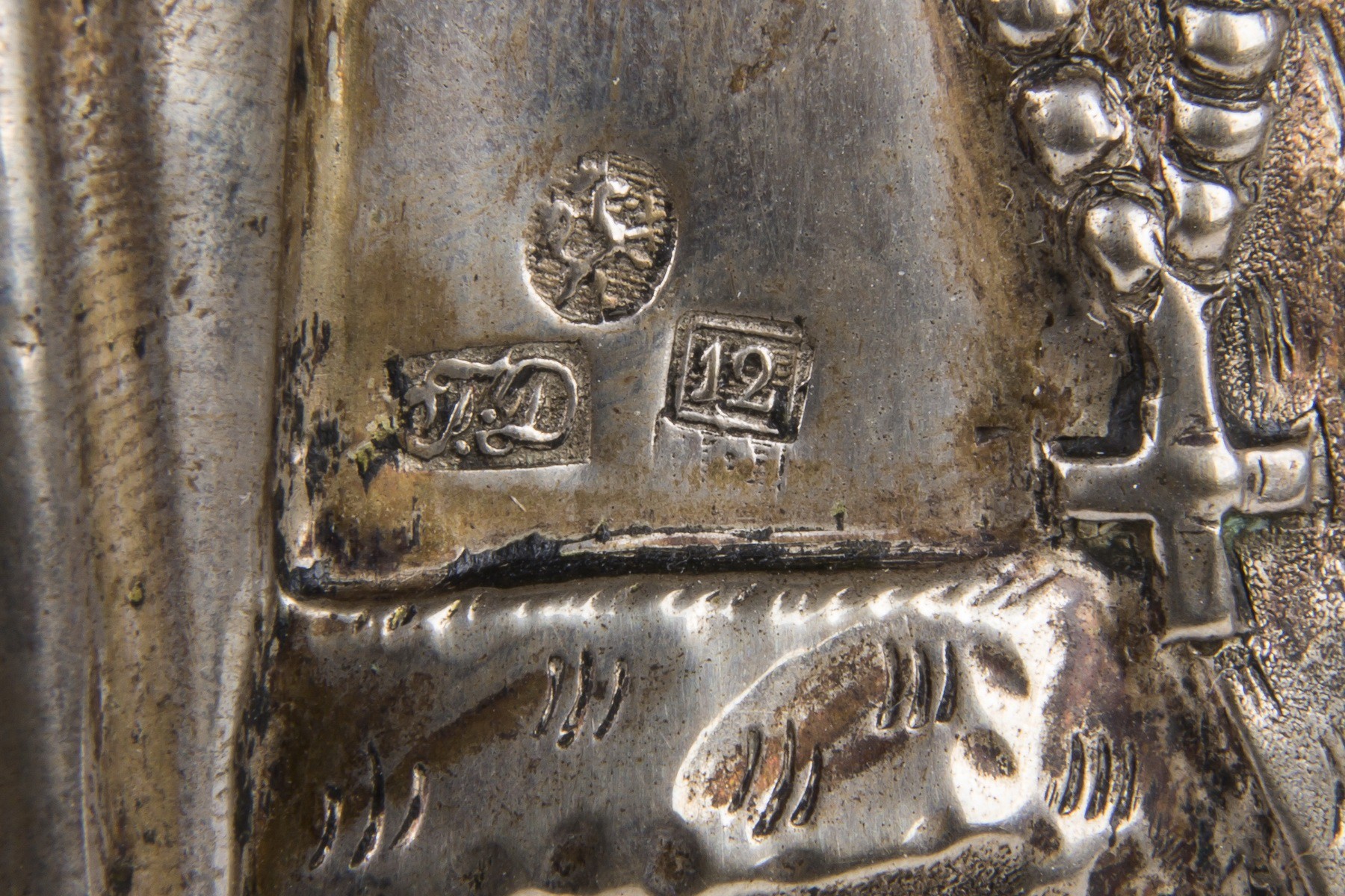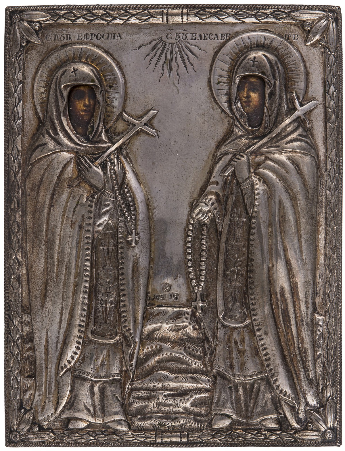 Дерево, левкас, темпера; серебро, чеканка, гравировка, золочение. Клейма: Польша; "12" - проба серебра; Г.·Д" - неизвестный мастер.