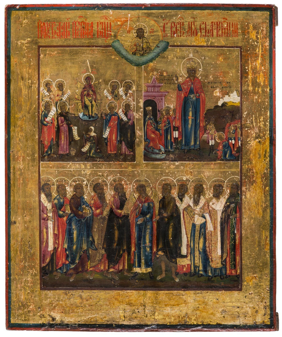 Трехчастная икона «Похвала Богоматери. Великомученица Екатерина. Избранные святые». - Россия, XIX в. - 31х26 см.