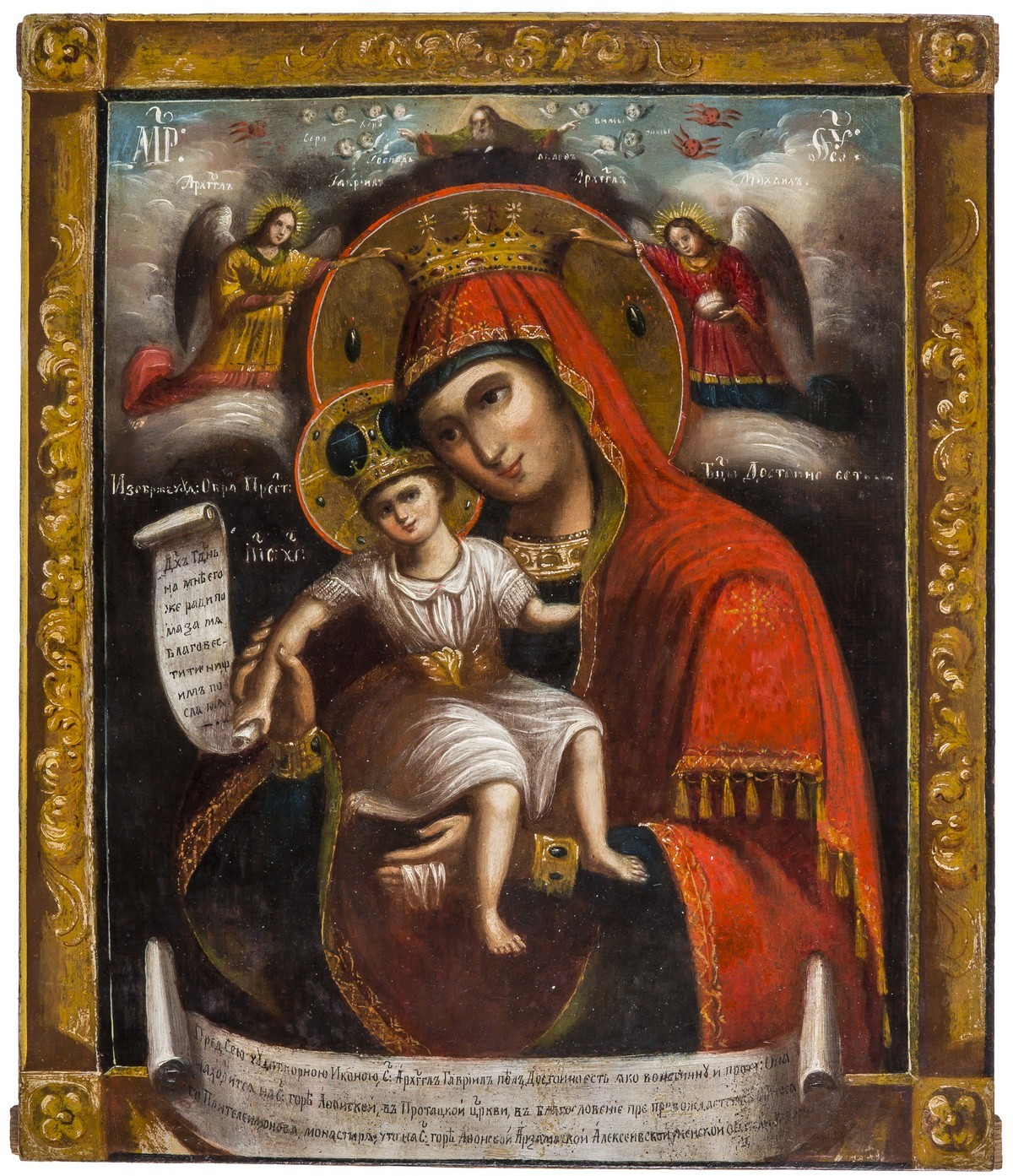 Дерево; масло, левкас. На нижнем поле иконы надпись: «Пред сею чудотворною иконою св. Архангел Гавриил пел: Достойно есть яко воистину и проч. Она находится на св. горе Афонской в Протацкой церкви, в благословение препровождается от Русского Пантелеимонова монастыря, что на св. горе Афонской, Алексеевской Арзамасской Обители 1853 (неразб.)».