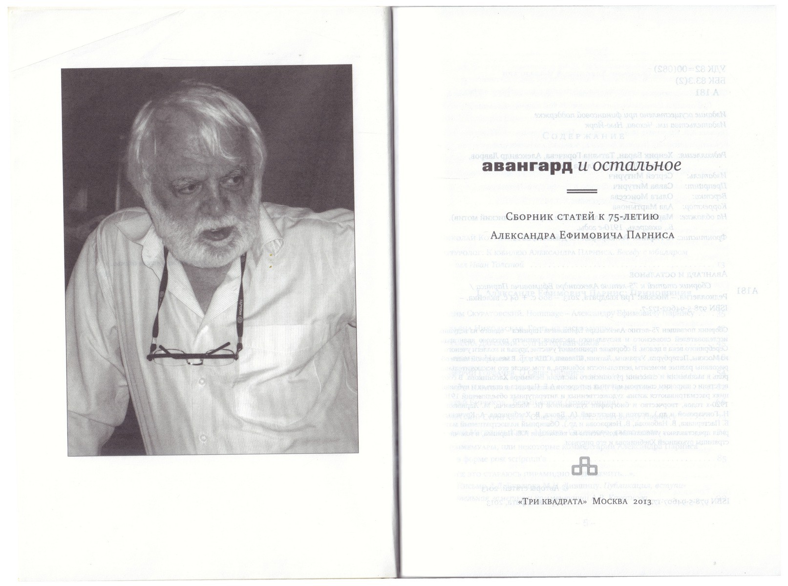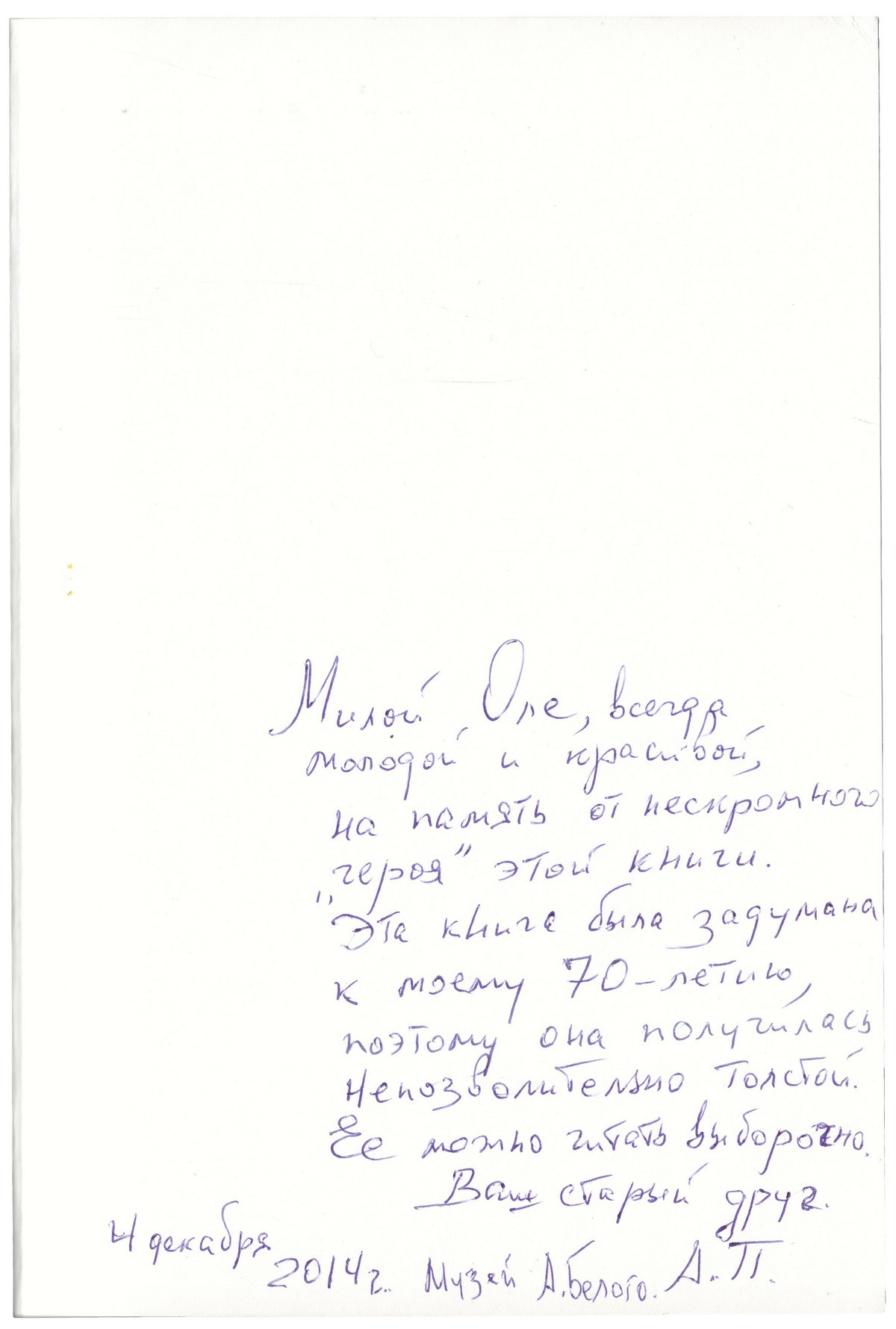 На свободном л. форзаца дарственная надпись А. Парниса, адресованная журналистке "Независимой газеты" О. Тимофеевой: "Дорогой Оле, всегда молодой и красивой! На память от нескромного героя этой книги. Эта книга была задумана к моему 70-летию, поэтому она получилась непозволительно толстой. Ее можно читать выборочно. Ваш старый друг / 4 декабря 2014 г. / Музей А. Белого / А.П."