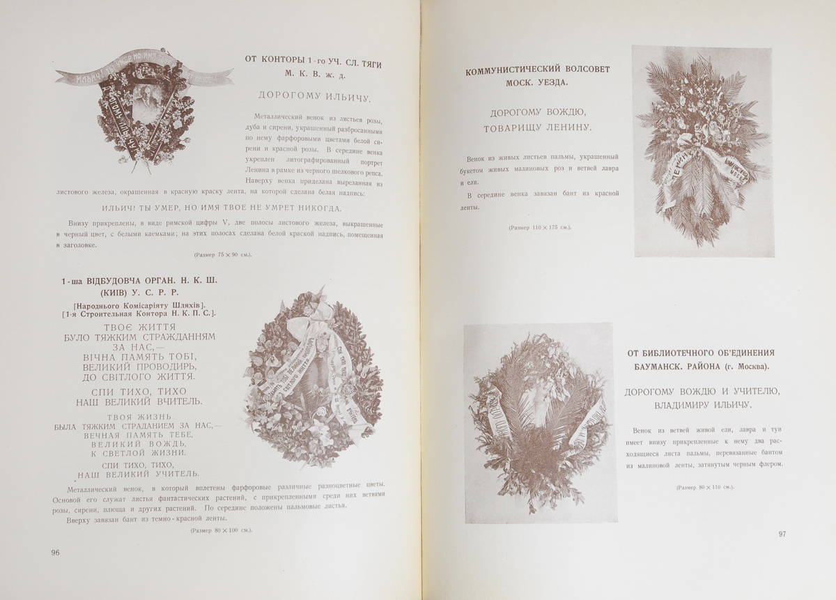 В книге приведены фотоизображения и описания предметов, возложенных на гроб В.И. Ленина: венков, лент, памятных досок и т.д. Есть и необычные предметы, например выделанная глыба красной яшмы от горняков; памятные таблички, изготовленные детьми; послания от иностранных делегаций.