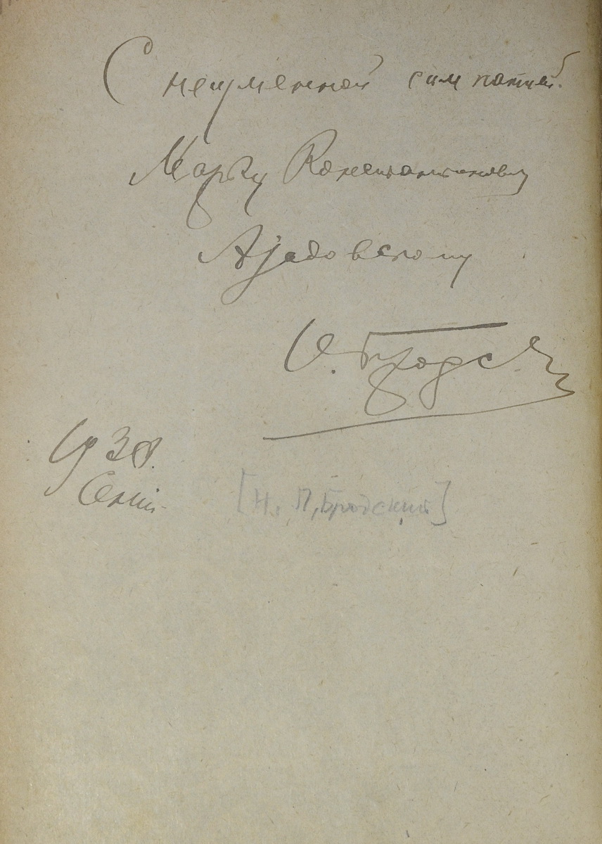 Николай Леонтьевич Бродский (1881-1951) — литературовед. Адресат надписи — фольклорист, литературовед и этнограф Марк Константинович Азадовский (1888-1954).