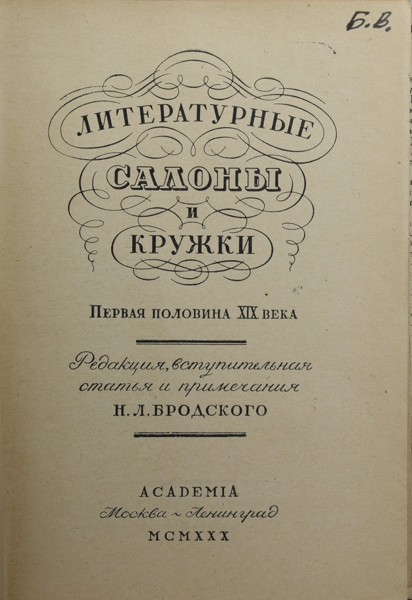 В издательском коленкоровом переплете и суперобложке. Незначительные надрывы суперобложки по корешку. Экслибрис Б.Н. Варавы на форзаце и влад. надпись на тит. л. Дарственная надпись Н.Л. Бродского на своб. л. форзаца: «С неизменной симпатией / Марку Константиновичу / Азадовскому / Н. Бродский 1930 Сент».