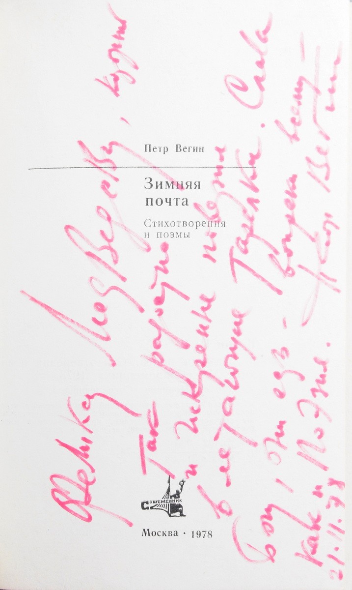 В цветной иллюстрированной издательской обложке. Экземпляр с дарственной надписью автора на тит. листе: «Феликсу Медведеву, который / Так радостно / и искренне поверил / в летающие тарелки. Слава / Богу , они есть — вопреки всему — как и поэзия. Петр Вегин / 21.11.78». На с. 23, 38-39, 113, 123, 126-127 — авторские пометы.