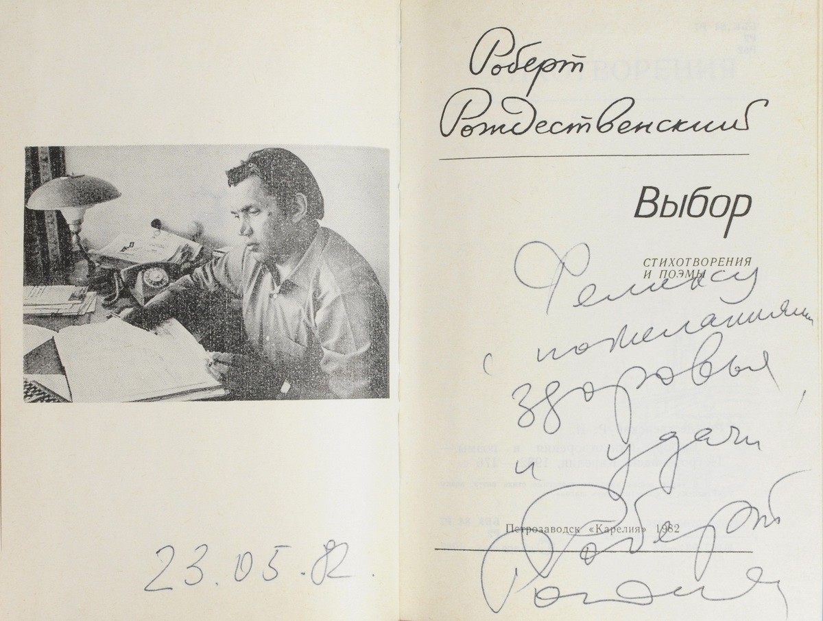 Дарственная надпись автора на тит. л.: «Феликсу / с пожеланиями / здоровья / и удачи / Роберт / Рождественский / 23.05.82». В издательском ледериновом переплете.