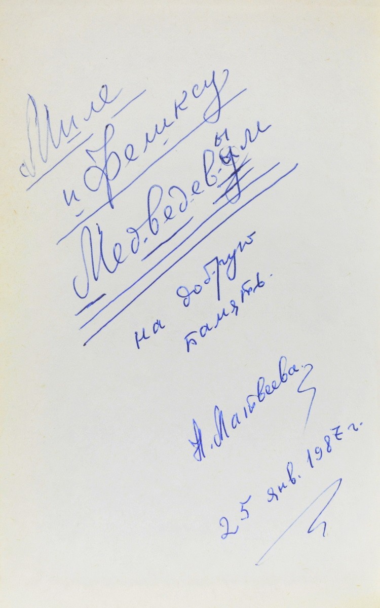 Дарственная надпись автора на свободном листе форзаца: «Миле / и Феликсу / Медведевым / на добрую / память. / Н. Матвеева. / 25 янв. 1987 г.». В издательском ледериновом переплете.