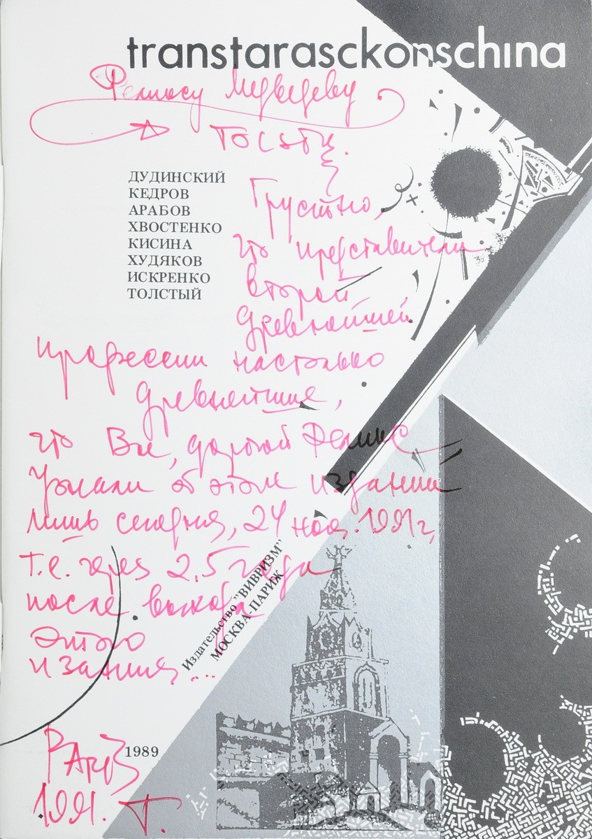 Трехцветная иллюстрированная издательская обложка. Экземпляр с дарственной надписью одного из авторов на тит. листе, адресованной журналисту Ф.Н. Медведеву: «Феликсу Медведеву / Tolstyy. / Груcтно, / что представители / второй / древнейшей / профессии настолько / древнейшие, / что Вы, дорогой Феликс, / узнали об этом издании / лишь сегодня, 24 ноя. 1991 г., / т. е. через 2,5 года / после выхода / этого / издания... / Paris / 1991. Т.». Коллекционная сохранность.