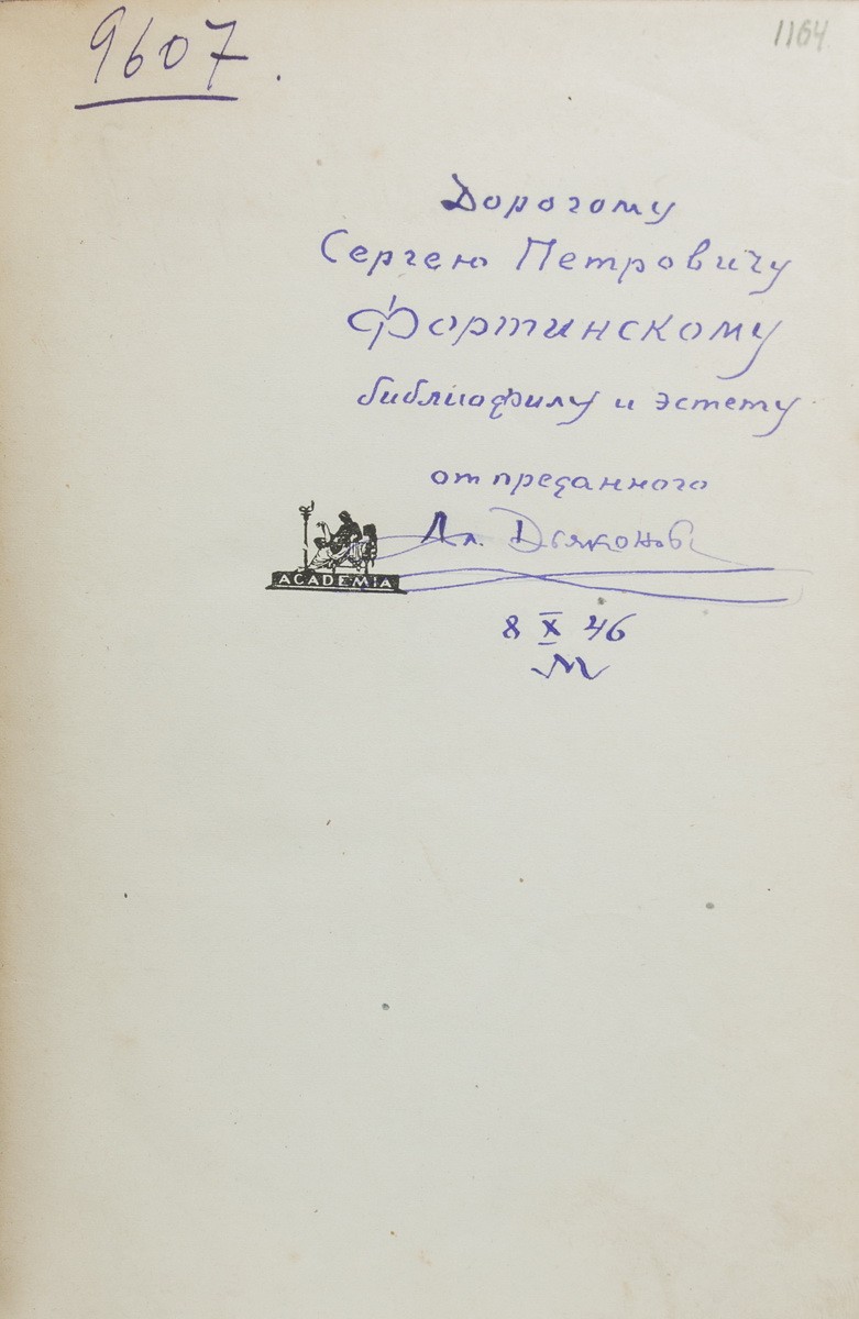 В коленкоровом издательском переплете и суперобложке по рисункам Б.В. Шварца. На с. 1 — влад. дарственная надпись, адресованная доктору юридических наук, «библиофилу и эстету» Сергею Петровичу Фортинскому (1906-1971) от А. Дьяконова.