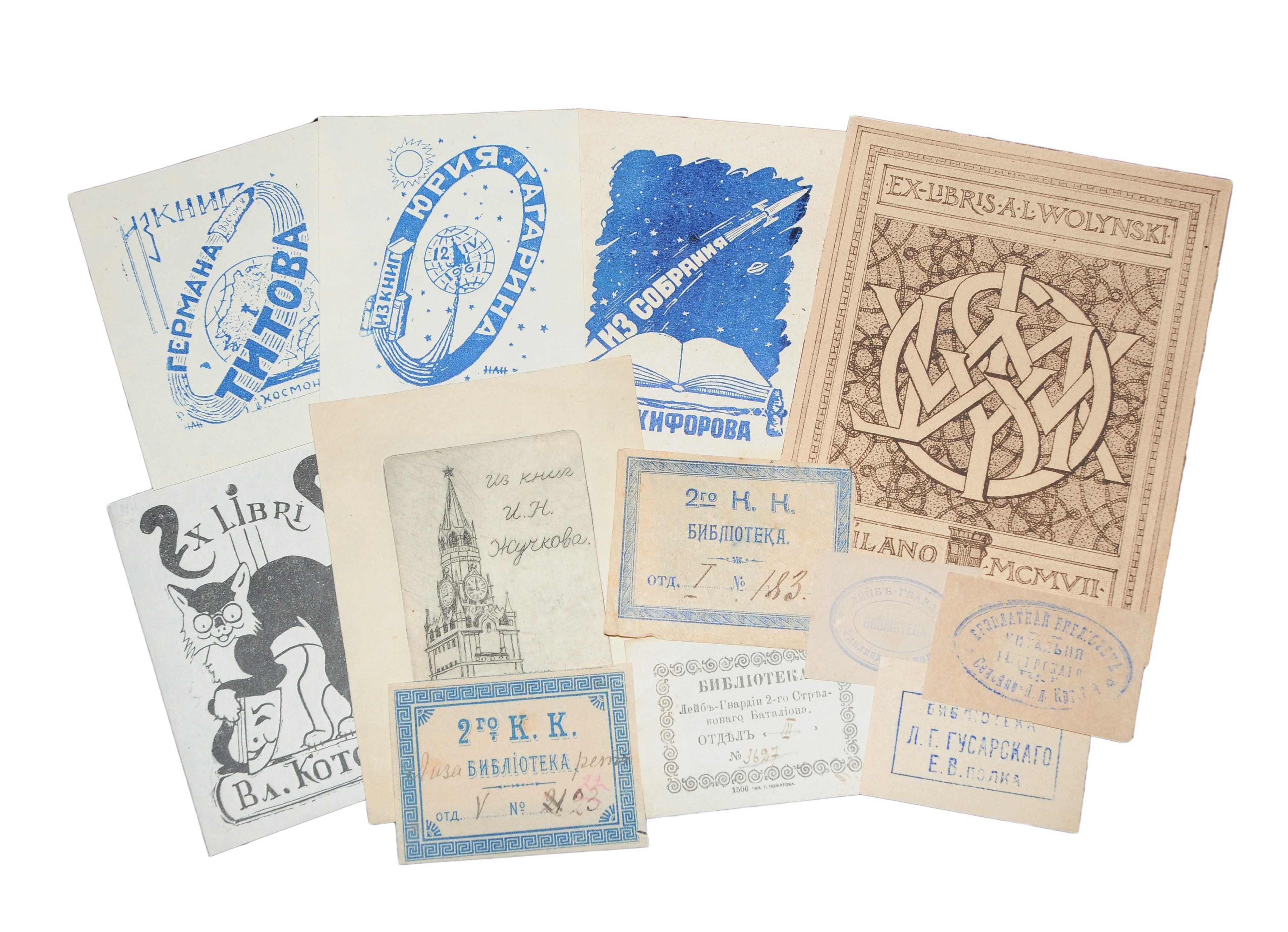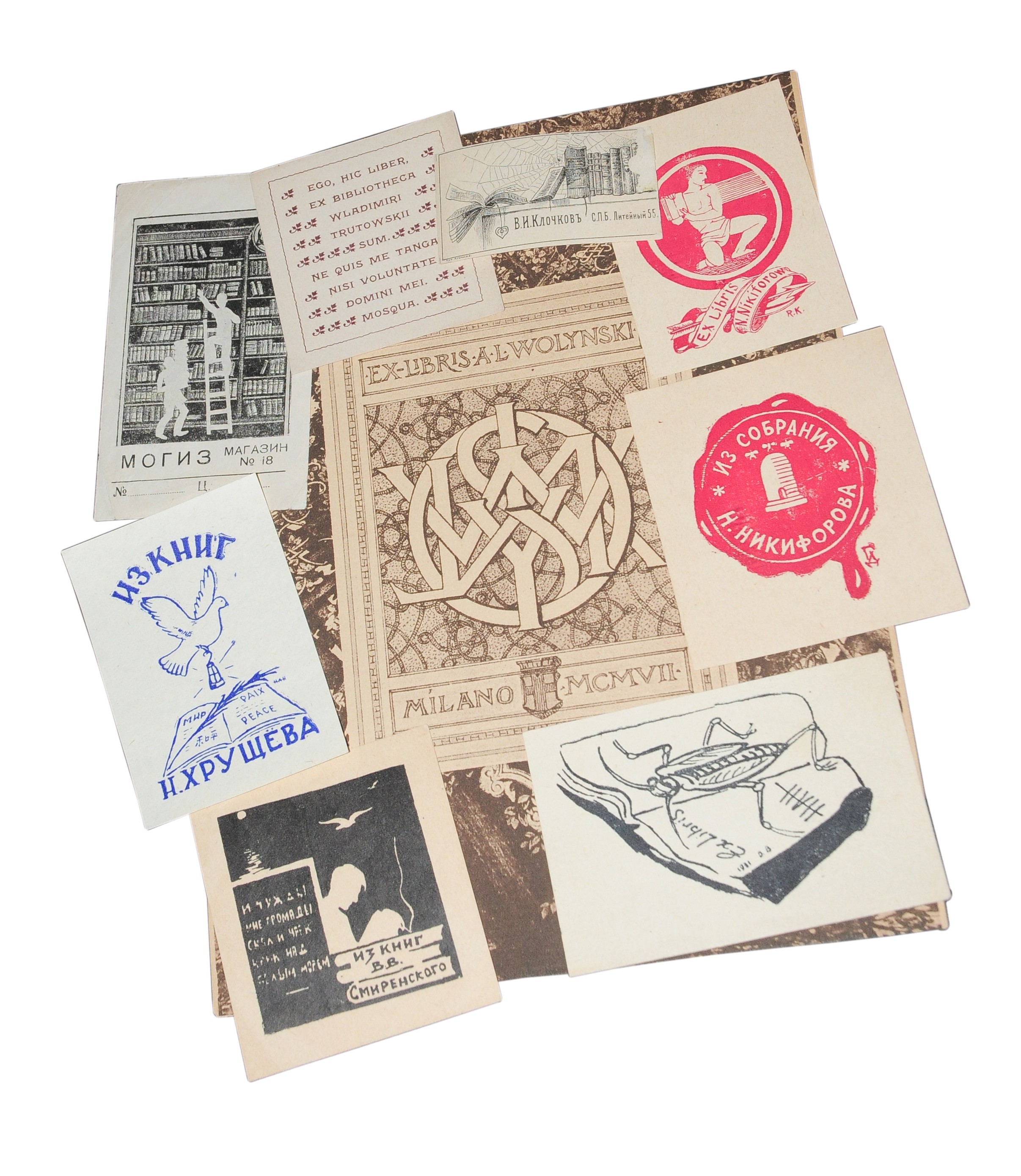 Дореволюционные штемпельные экслибрисы, вензельный экслибрис Акима Волынского (Милан, 1907), целый ряд экслибрисов Н. Никифорова, в т.ч. Работы Д. Бурлюка, Г. Карлова и др.
