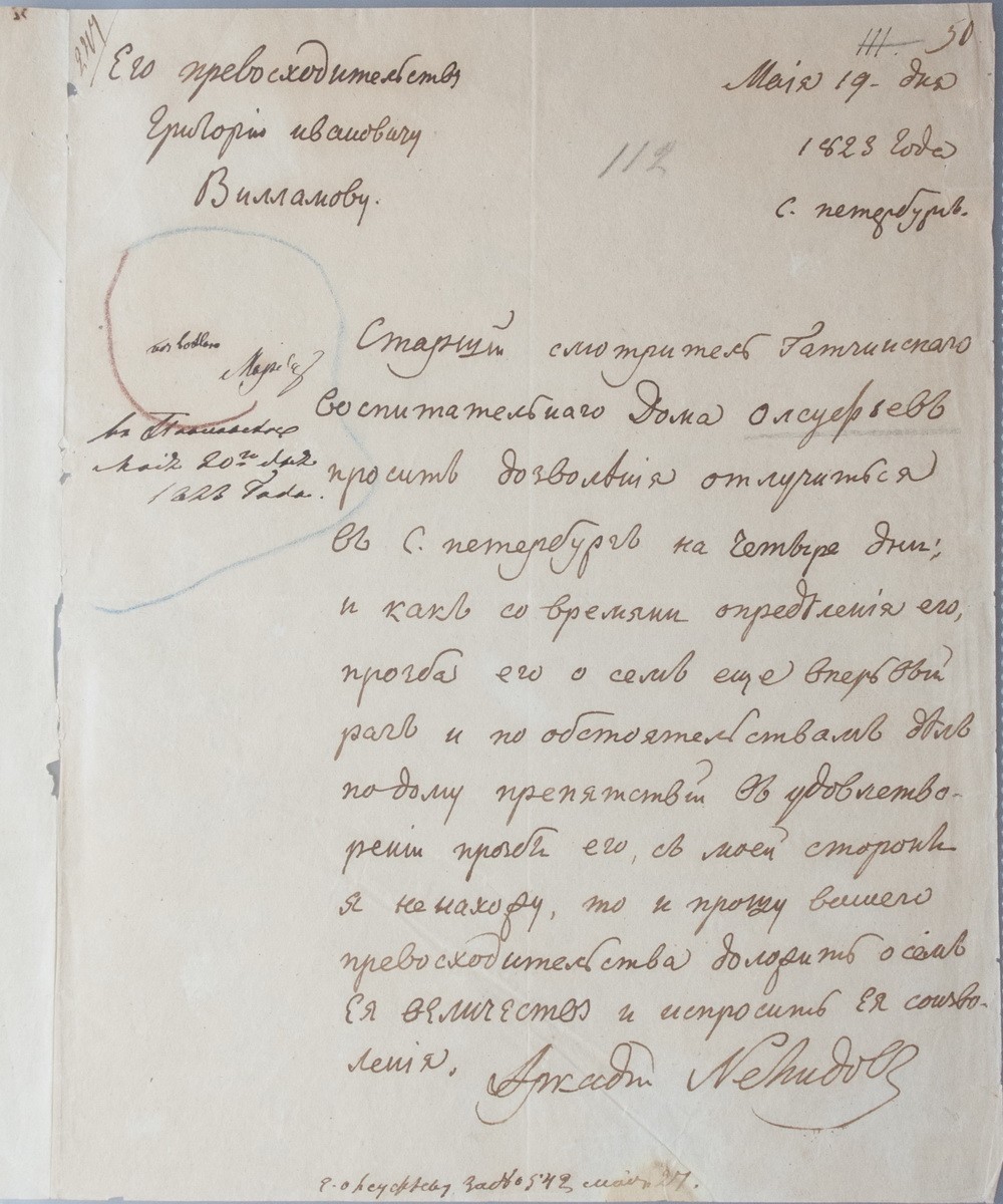 В своем письме генерал-лейтенант Аркадий Иванович Нелидов (1773-1834), являвшийся в это время почётным опекуном Санкт-Петербургского опекунского общества, передает просьбу старшего смотрителя Гатчинского воспитательного дома Олсуфьева о дозволении отлучиться в Санкт-Петербург на 3 дня. Не находя препятствий в удовлетворении данной просьбы А.И. Нелидов просит довести ее до Ее Величества императрицы, которая во время своего вдовства была главным покровителем и управителем Императорского Человеколюбивого общества, объединявшего более 30 благотворительных учреждений по всей России.
