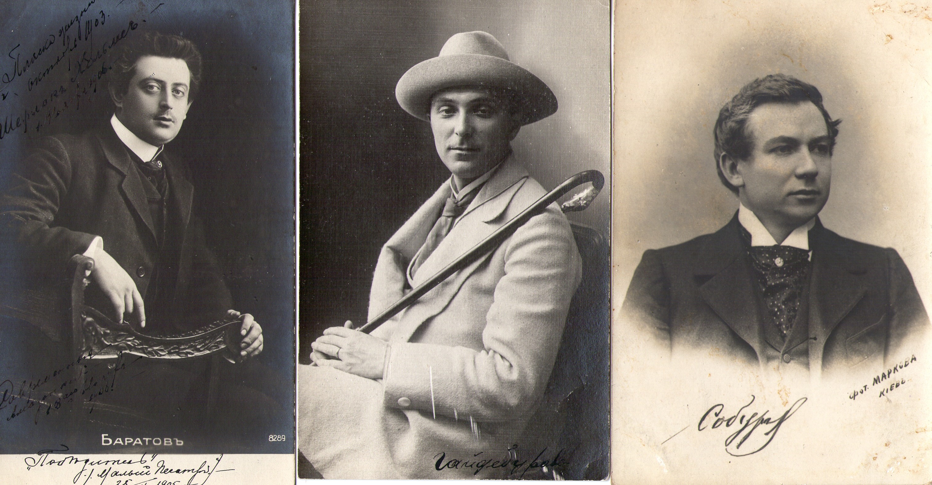 Три фотооткрытки. Автографы: «”Пляска жизни” / октябрь 1903. — / Шерлок Холмс. — Ноябрь 1906. / “Современные / Амазонки” / 18-го ноября / 1906 . — / “Победитель” / (Малый Театр.) — / 25 II 1905. —»; «Сабуров», «Гайдабуров».